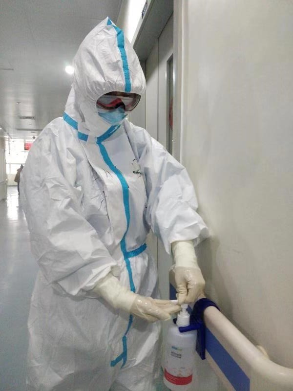 穿上防护服之后,行动很不方便,即使转身,身体要和脑袋一起转动。从更衣室到隔离病房,还需要经过三层检查,确保身体的任何部位都没有暴露在空气中,哪怕是一根头发。有一次李寰从隔离区出来,有几根头发暴露了,护士用酒精对着她的头发一阵猛喷,然后用剪刀把那一缕头发剪掉了。