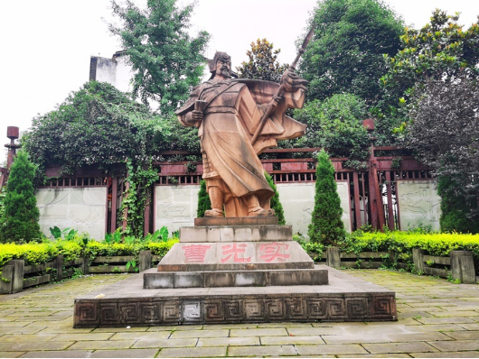 手持长枪,身披战袍,眺望远方,在国道108线名山区百丈镇王家村附近的“曹光实文化广场”,一座曹光实的雕塑巍然屹立。