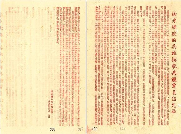 一级战斗英雄伍先华事迹材料(遂宁市档案馆提供)