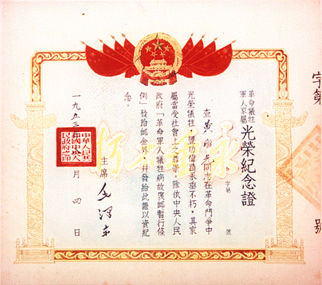 毛主席签发的革命牺牲军人家属光荣纪念证(中江县档案馆提供)