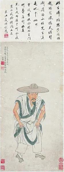 明代曾鲸的《苏文忠公笠屐图》、唐寅的《东坡笠屐图》、钱谷的《东坡笠屐图》,清代余集的《苏文忠公笠屐图》、杨浚的《坡公笠屐图》等作品中苏东坡戴笠穿屐提衣的形象基本都是延续了李公麟所创作的苏东坡俯身提衣的主体形象,但在人物面部表情、精神状态和衣着形式上却各有千秋。曾鲸、朱之蕃、余集、杨浚作品中的苏东坡衣着仍然延续了李公麟《东坡笠屐图》中的苏东坡文人装扮,且精神状态仍然是文人雅士的儒雅谦恭面貌,而钱谷的《东坡笠屐图》却与现存的“东坡笠屐”主题创作均不相同,画面中苏东坡穿着农人常穿的短衣,且人物形象不再有史料记载中怡然自得的闲暇状态,而是以严肃思考的形象出现,人物脸部也不再做圆润丰满状的表现,而是有了岁月的沧桑感,似乎钱谷画面中的苏东坡只是一介乡野村夫——在经历了仕途坎坷之后,苏东坡是否也更愿意过一种真正的“晨兴理荒秽,带月荷锄归”的乡间生活,抑或说,在长达20年谪居在外的生活中,他已将自己从内到外地转换为一个真正的乡野村夫了。