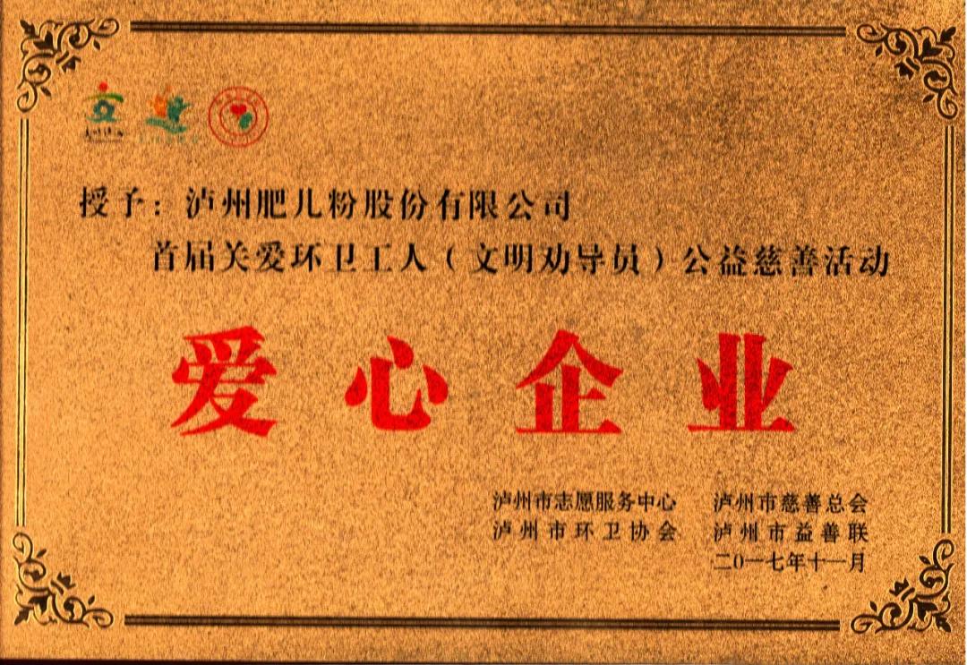 2017年11月,泸州肥儿粉股份有限公司被授予泸州市慈善总会等部门授予首届关爱环卫工人公益慈善活动爱心企业(陈宗华 供图)