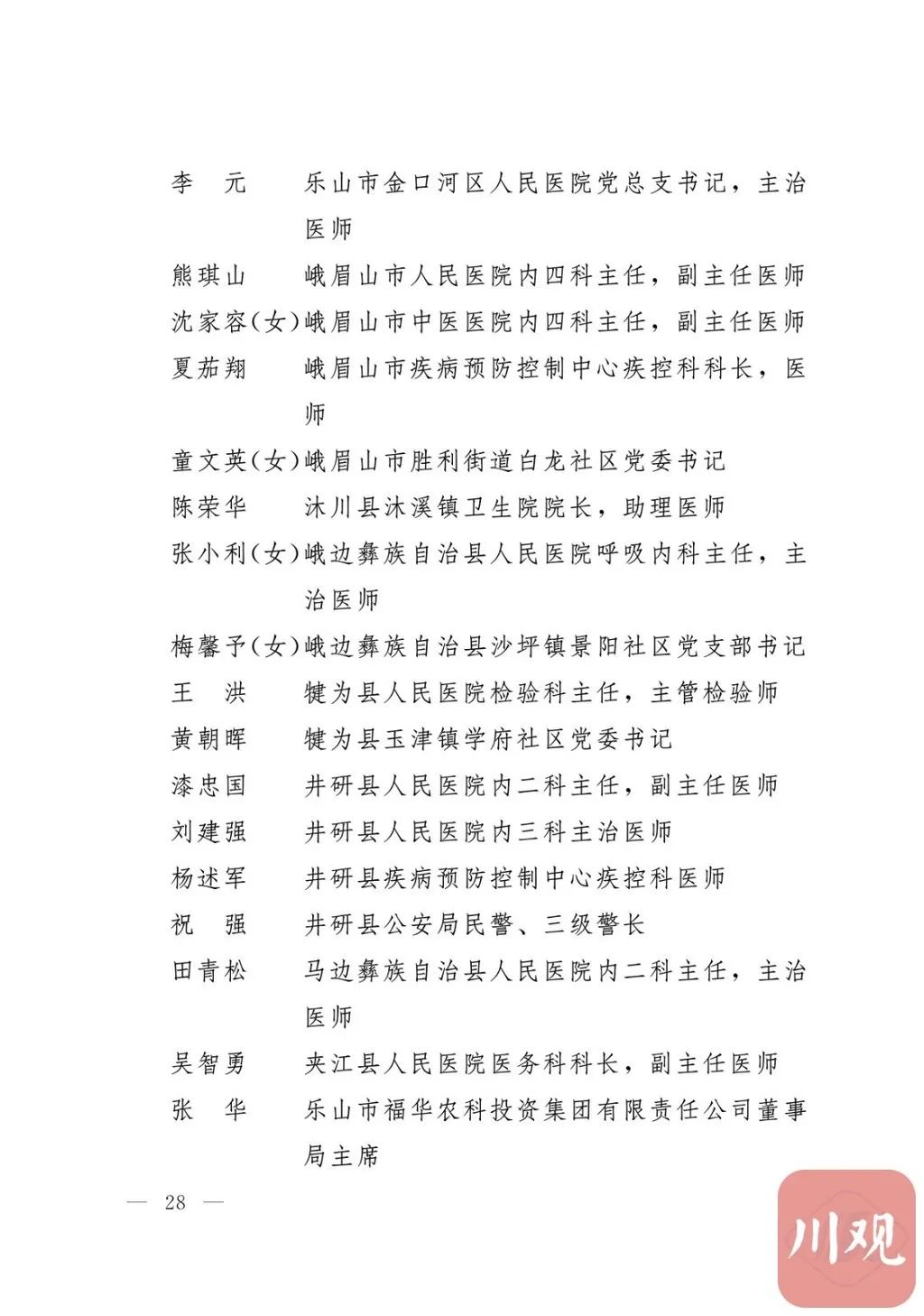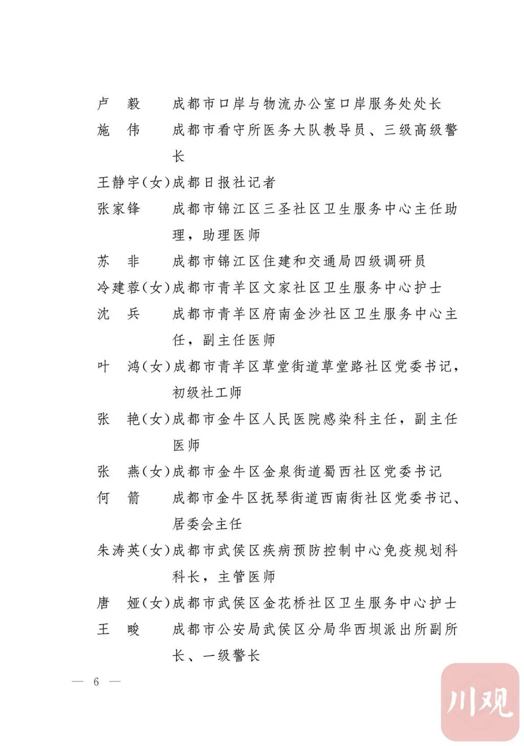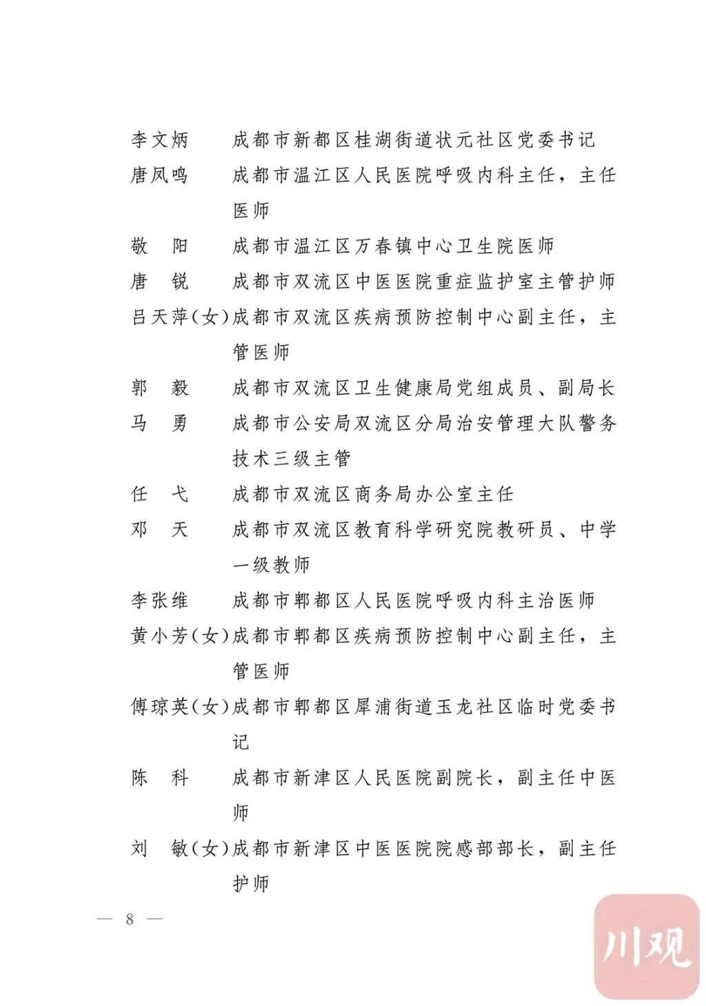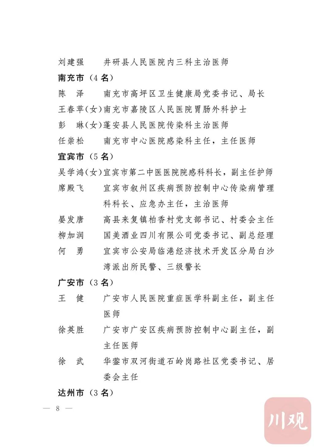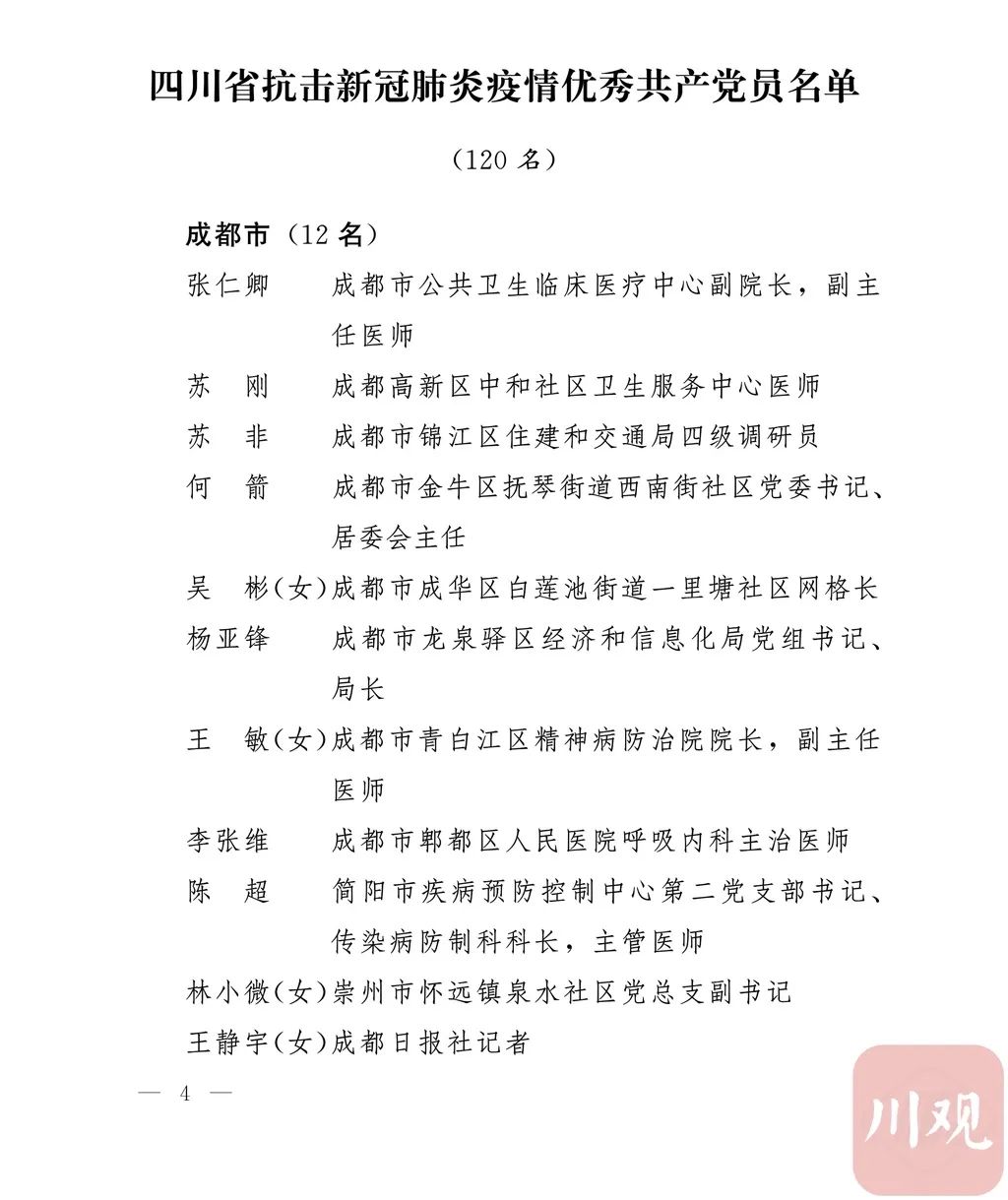 新冠肺炎疫情发生后,以习近平同志为核心的党中央统揽全局、果断决策、沉着应对,领导全党全军全国各族人民打好疫情防控的人民战争、总体战、阻击战,夺取了抗疫斗争重大战略成果。省委深入学习贯彻习近平总书记关于疫情防控工作重要讲话和重要指示批示精神,坚决贯彻党中央决策部署,团结带领全省上下认真落实坚定信心、同舟共济、科学防治、精准施策总要求,同时间赛跑,与病魔较量,凝聚起众志成城、无坚不摧的磅礴力量,疫情防控取得重大战略成果。广大基层党组织闻令而动、主动担责、守土尽责,充分发挥战斗堡垒作用,筑起守护人民生命安全和身体健康的严密防护网;广大党员挺身而出、冲锋在前,不畏生死、英勇奉献,充分发挥先锋模范作用,当好人民群众最可靠的主心骨,让鲜红的党旗在疫情防控斗争第一线高高飘扬,书写了可歌可泣、荡气回肠的壮丽篇章。为弘扬伟大抗疫精神,激励各级党组织和广大党员干部不忘初心、牢记使命,勇往直前、接续奋斗,省委决定,授予张仁卿等117名共产党员“四川省优秀共产党员”称号,追授高义泉等3名共产党员“四川省优秀共产党员”称号,授予成都市疾病预防控制中心党委等100个基层党组织“四川省先进基层党组织”称号。希望受表彰的党员和党组织珍惜荣誉、再接再厉,充分发挥模范带头作用,为党和人民事业再立新功。这次受表彰的优秀共产党员和先进基层党组织,是全省抗击新冠肺炎疫情先进个人和先进集体中的优秀代表。他们的先进事迹和崇高精神,有力彰显了中国共产党无比坚强的领导力,集中体现了中国特色社会主义制度的显著优势,鲜明昭示了党全心全意为人民服务的根本宗旨,全面反映了坚决做到“两个维护”的实际成效,充分展现了共产党人的担当和风骨。全省各级党组织和广大党员干部要以他们为榜样,学习他们信念坚定、对党忠诚的政治品质,牢记宗旨、服务群众的为民情怀,迎难而上、敢于斗争的坚定意志,恪尽职守、无私奉献的优良作风,切实增强“四个意识”、坚定“四个自信”、做到“两个维护”,始终把人民放在心中最高位置、保持同人民群众的血肉联系,关键时刻冲得上去、危难关头豁得出来、重大斗争中经得起考验,忠诚履职、团结一致,汇聚起干事创业的强大力量。当前,决胜全面建成小康社会、决战脱贫攻坚的目标任务艰巨而繁重,开启全面建设社会主义现代化国家新征程、向第二个百年奋斗目标进军的时代使命神圣而光荣。各级党组织和广大党员干部要更加紧密地团结在以习近平同志为核心的党中央周围,坚持以习近平新时代中国特色社会主义思想为指导,认真学习贯彻党的十九大和十九届二中、三中、四中、五中全会精神,深入贯彻习近平总书记对四川工作系列重要指示精神,全面落实党中央和省委决策部署,提高政治能力,保持战略定力,脚踏实地、埋头苦干,锐意进取、砥砺前行,在危机中育先机、于变局中开新局,统筹推进常态化疫情防控和经济社会发展,加快推进成渝地区双城经济圈建设,为谱写四川“十四五”发展新篇章、推动治蜀兴川再上新台阶作出新的更大贡献。四川省抗击新冠肺炎疫情优秀共产党员名单(120名)四川省抗击新冠肺炎疫情先进基层党组织名单(100个)中共四川省委