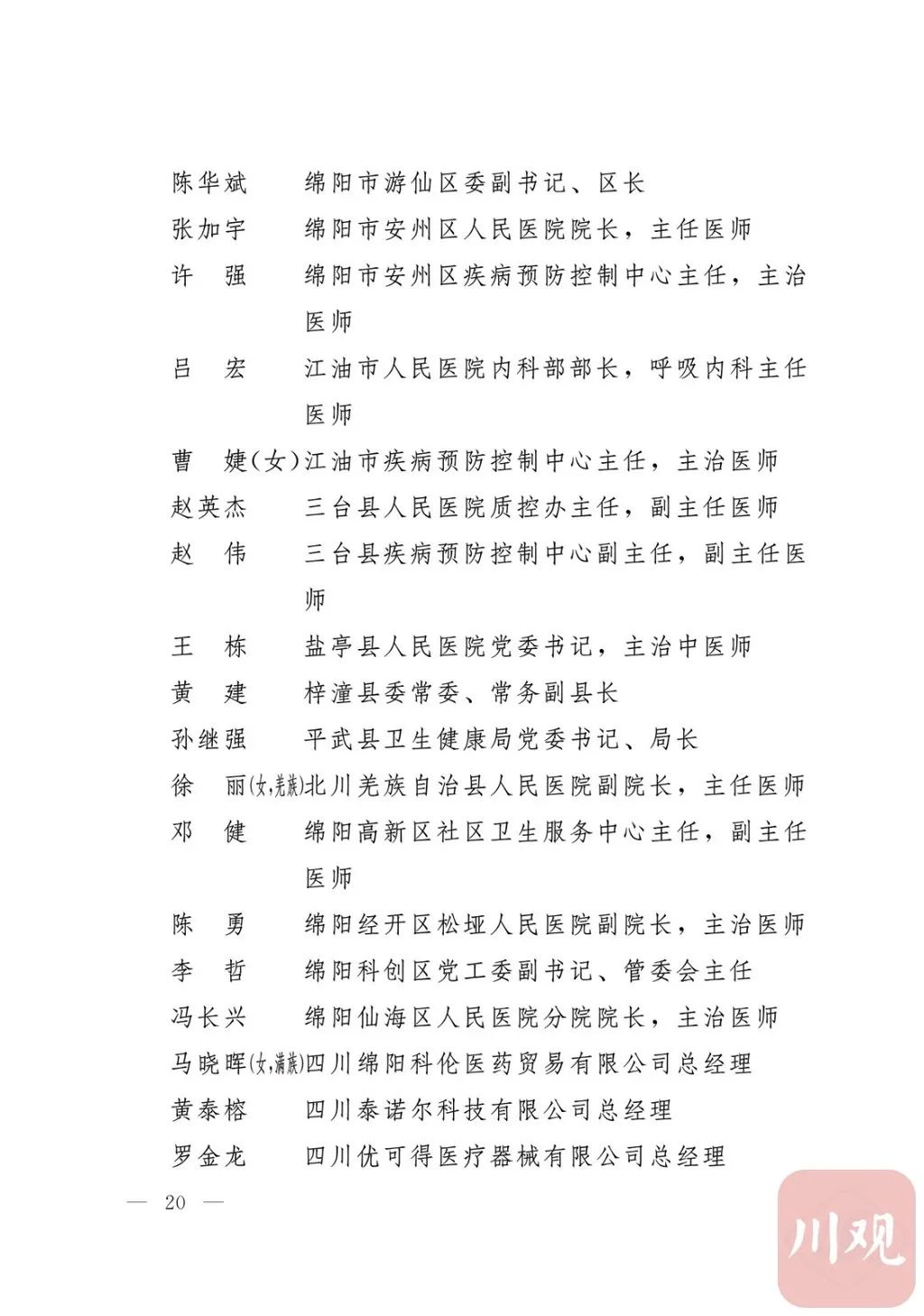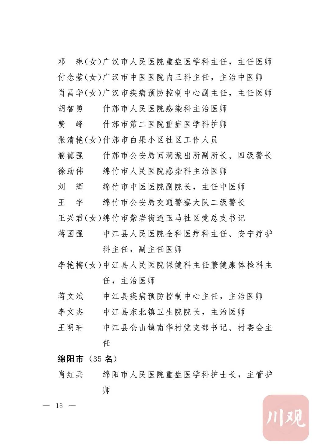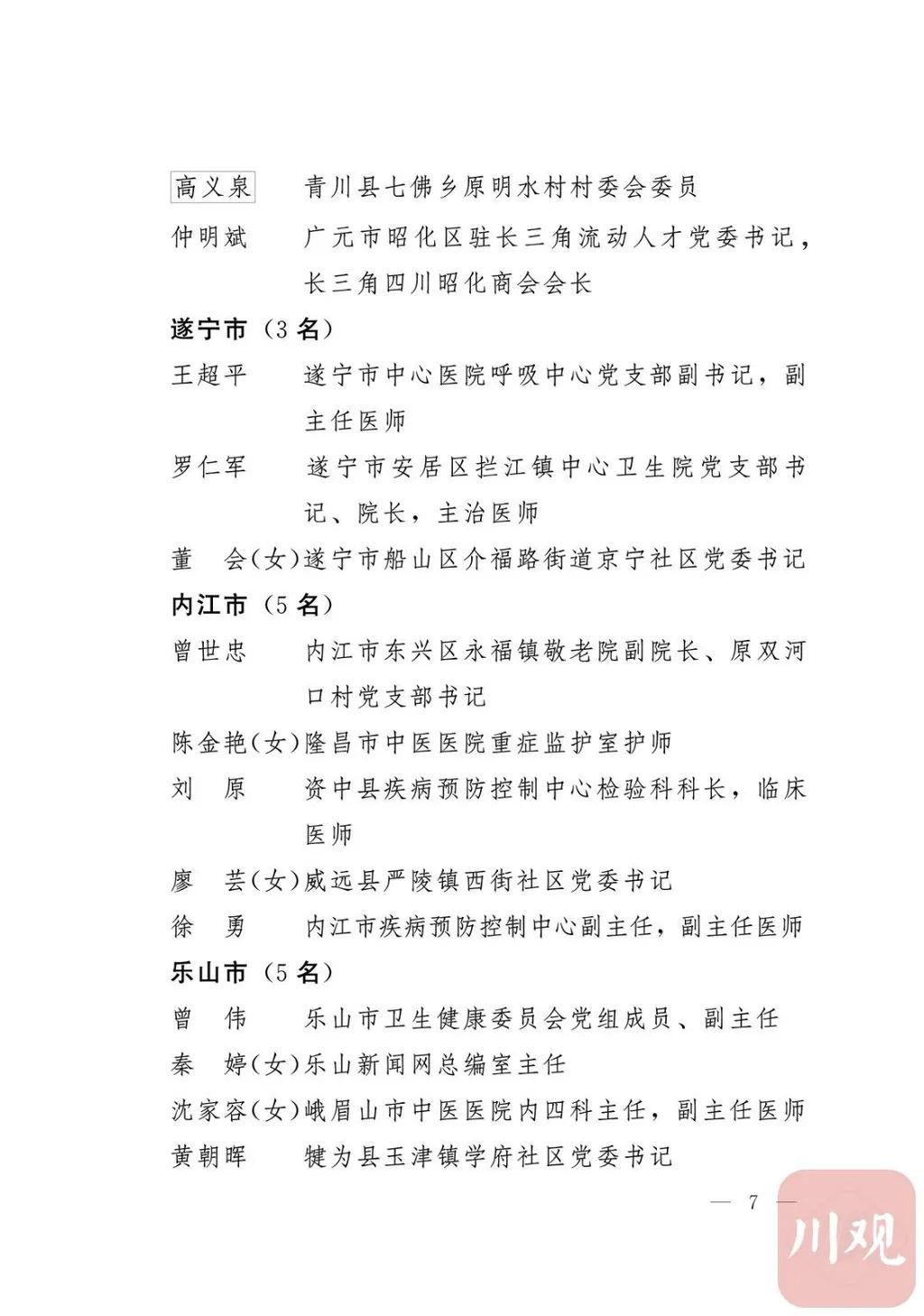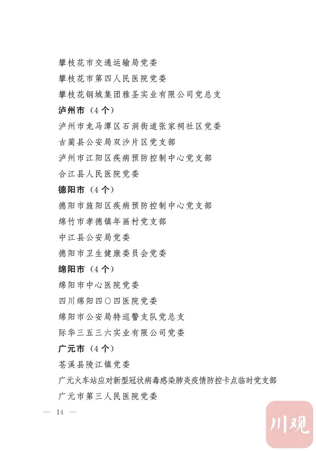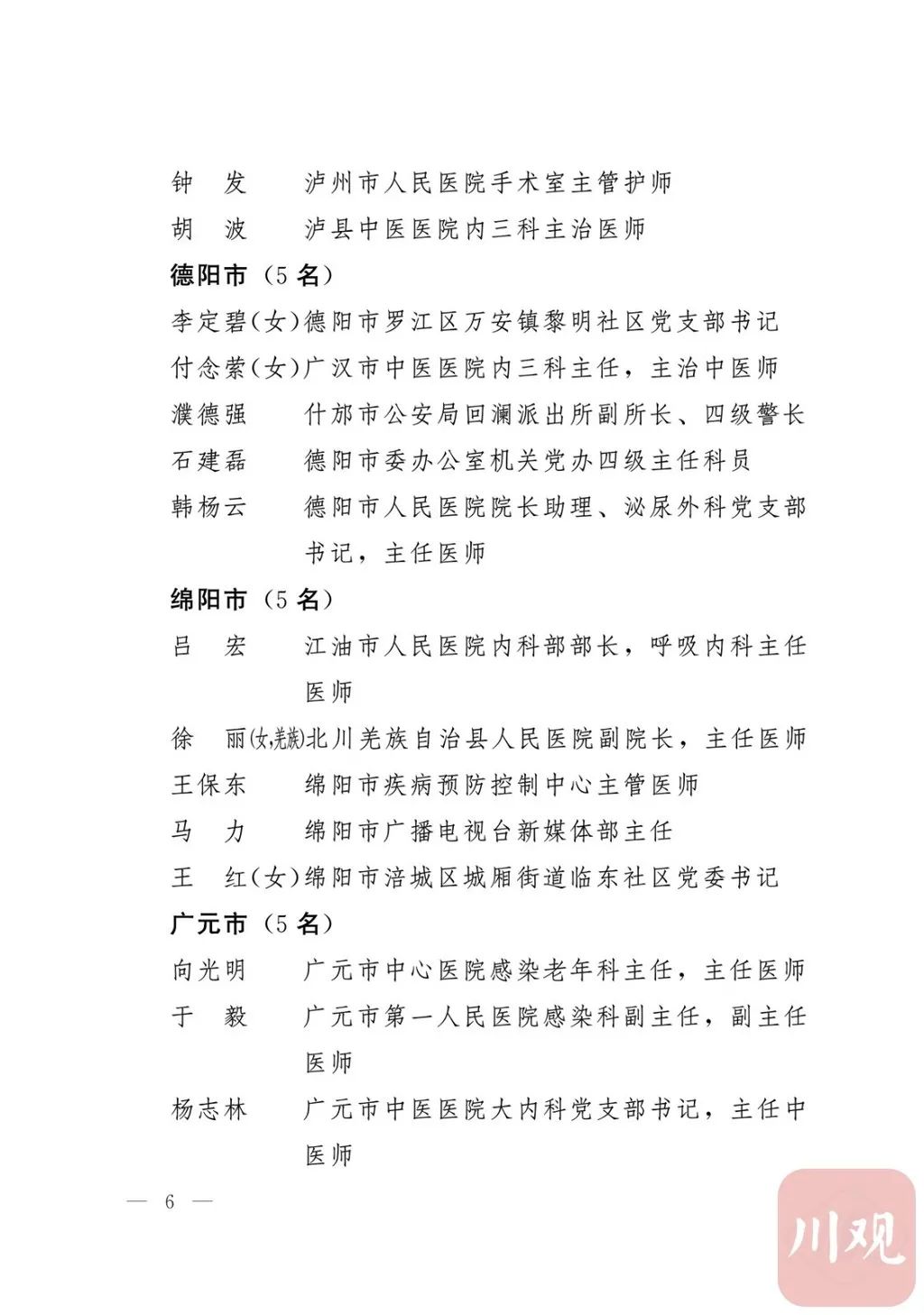 新冠肺炎疫情发生后,以习近平同志为核心的党中央统揽全局、果断决策、沉着应对,领导全党全军全国各族人民打好疫情防控的人民战争、总体战、阻击战,夺取了抗疫斗争重大战略成果。省委深入学习贯彻习近平总书记关于疫情防控工作重要讲话和重要指示批示精神,坚决贯彻党中央决策部署,团结带领全省上下认真落实坚定信心、同舟共济、科学防治、精准施策总要求,同时间赛跑,与病魔较量,凝聚起众志成城、无坚不摧的磅礴力量,疫情防控取得重大战略成果。广大基层党组织闻令而动、主动担责、守土尽责,充分发挥战斗堡垒作用,筑起守护人民生命安全和身体健康的严密防护网;广大党员挺身而出、冲锋在前,不畏生死、英勇奉献,充分发挥先锋模范作用,当好人民群众最可靠的主心骨,让鲜红的党旗在疫情防控斗争第一线高高飘扬,书写了可歌可泣、荡气回肠的壮丽篇章。为弘扬伟大抗疫精神,激励各级党组织和广大党员干部不忘初心、牢记使命,勇往直前、接续奋斗,省委决定,授予张仁卿等117名共产党员“四川省优秀共产党员”称号,追授高义泉等3名共产党员“四川省优秀共产党员”称号,授予成都市疾病预防控制中心党委等100个基层党组织“四川省先进基层党组织”称号。希望受表彰的党员和党组织珍惜荣誉、再接再厉,充分发挥模范带头作用,为党和人民事业再立新功。这次受表彰的优秀共产党员和先进基层党组织,是全省抗击新冠肺炎疫情先进个人和先进集体中的优秀代表。他们的先进事迹和崇高精神,有力彰显了中国共产党无比坚强的领导力,集中体现了中国特色社会主义制度的显著优势,鲜明昭示了党全心全意为人民服务的根本宗旨,全面反映了坚决做到“两个维护”的实际成效,充分展现了共产党人的担当和风骨。全省各级党组织和广大党员干部要以他们为榜样,学习他们信念坚定、对党忠诚的政治品质,牢记宗旨、服务群众的为民情怀,迎难而上、敢于斗争的坚定意志,恪尽职守、无私奉献的优良作风,切实增强“四个意识”、坚定“四个自信”、做到“两个维护”,始终把人民放在心中最高位置、保持同人民群众的血肉联系,关键时刻冲得上去、危难关头豁得出来、重大斗争中经得起考验,忠诚履职、团结一致,汇聚起干事创业的强大力量。当前,决胜全面建成小康社会、决战脱贫攻坚的目标任务艰巨而繁重,开启全面建设社会主义现代化国家新征程、向第二个百年奋斗目标进军的时代使命神圣而光荣。各级党组织和广大党员干部要更加紧密地团结在以习近平同志为核心的党中央周围,坚持以习近平新时代中国特色社会主义思想为指导,认真学习贯彻党的十九大和十九届二中、三中、四中、五中全会精神,深入贯彻习近平总书记对四川工作系列重要指示精神,全面落实党中央和省委决策部署,提高政治能力,保持战略定力,脚踏实地、埋头苦干,锐意进取、砥砺前行,在危机中育先机、于变局中开新局,统筹推进常态化疫情防控和经济社会发展,加快推进成渝地区双城经济圈建设,为谱写四川“十四五”发展新篇章、推动治蜀兴川再上新台阶作出新的更大贡献。四川省抗击新冠肺炎疫情优秀共产党员名单(120名)四川省抗击新冠肺炎疫情先进基层党组织名单(100个)中共四川省委