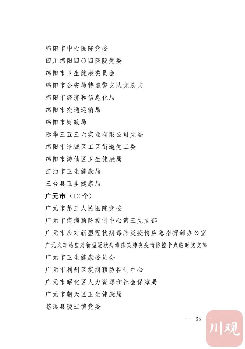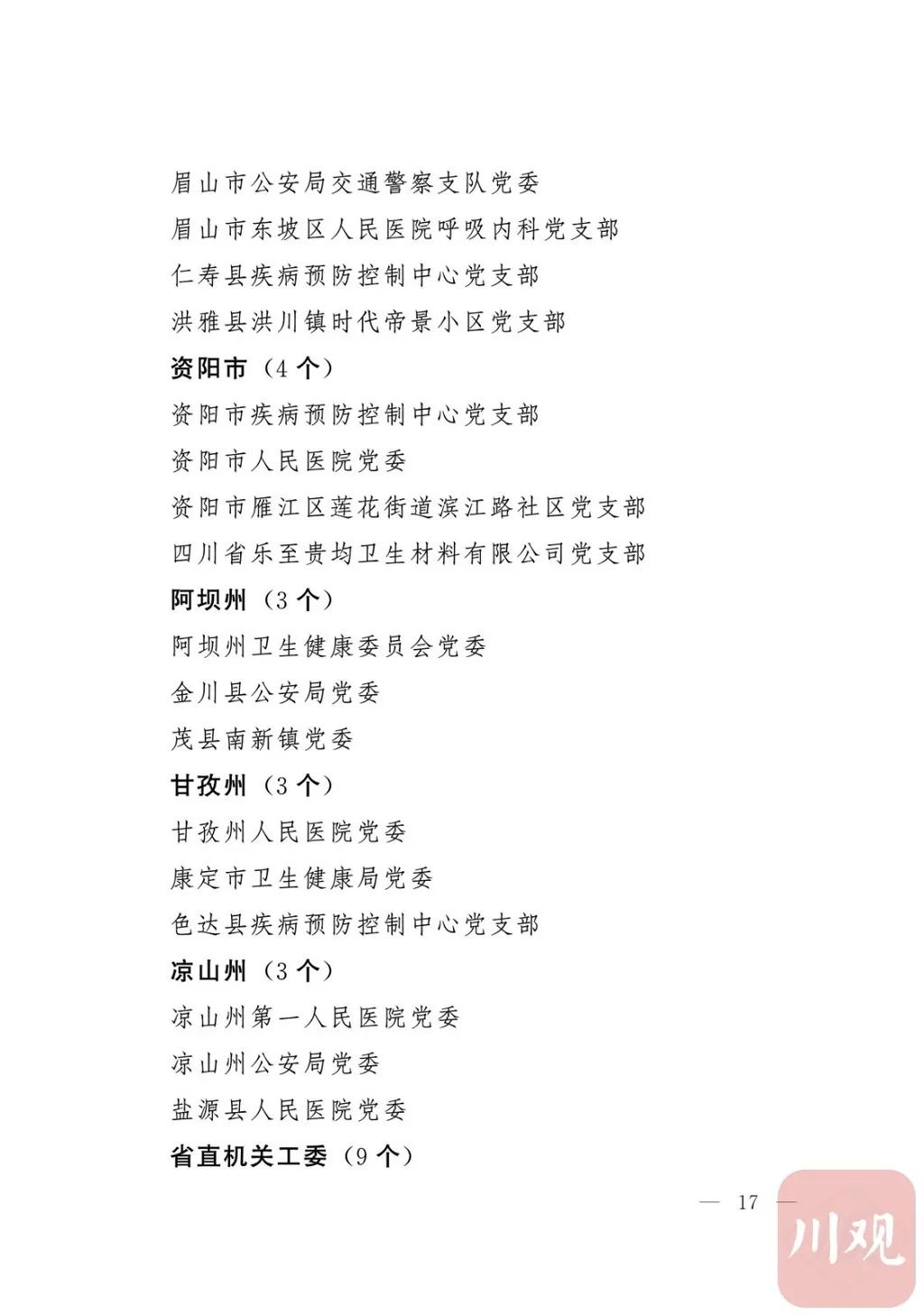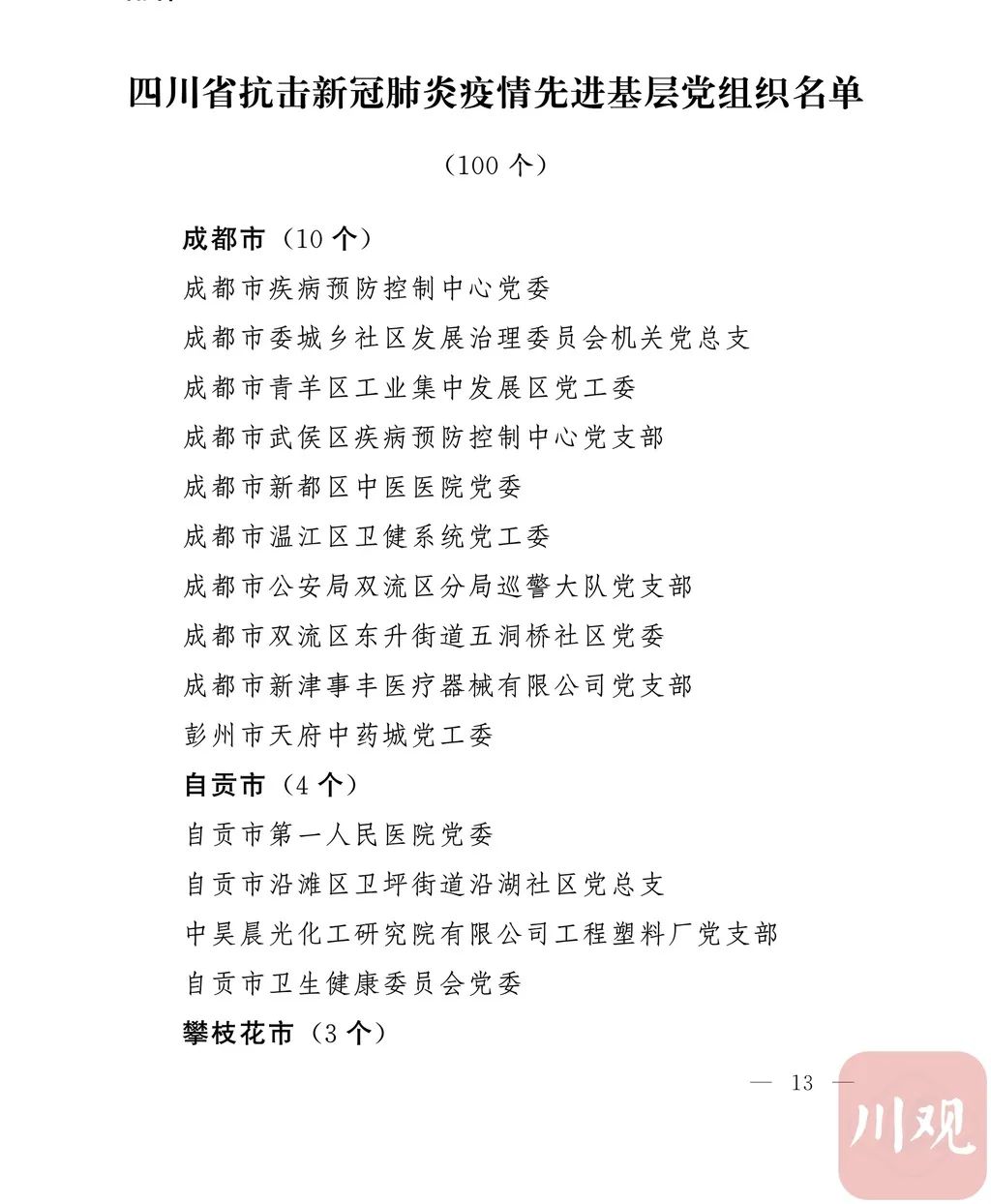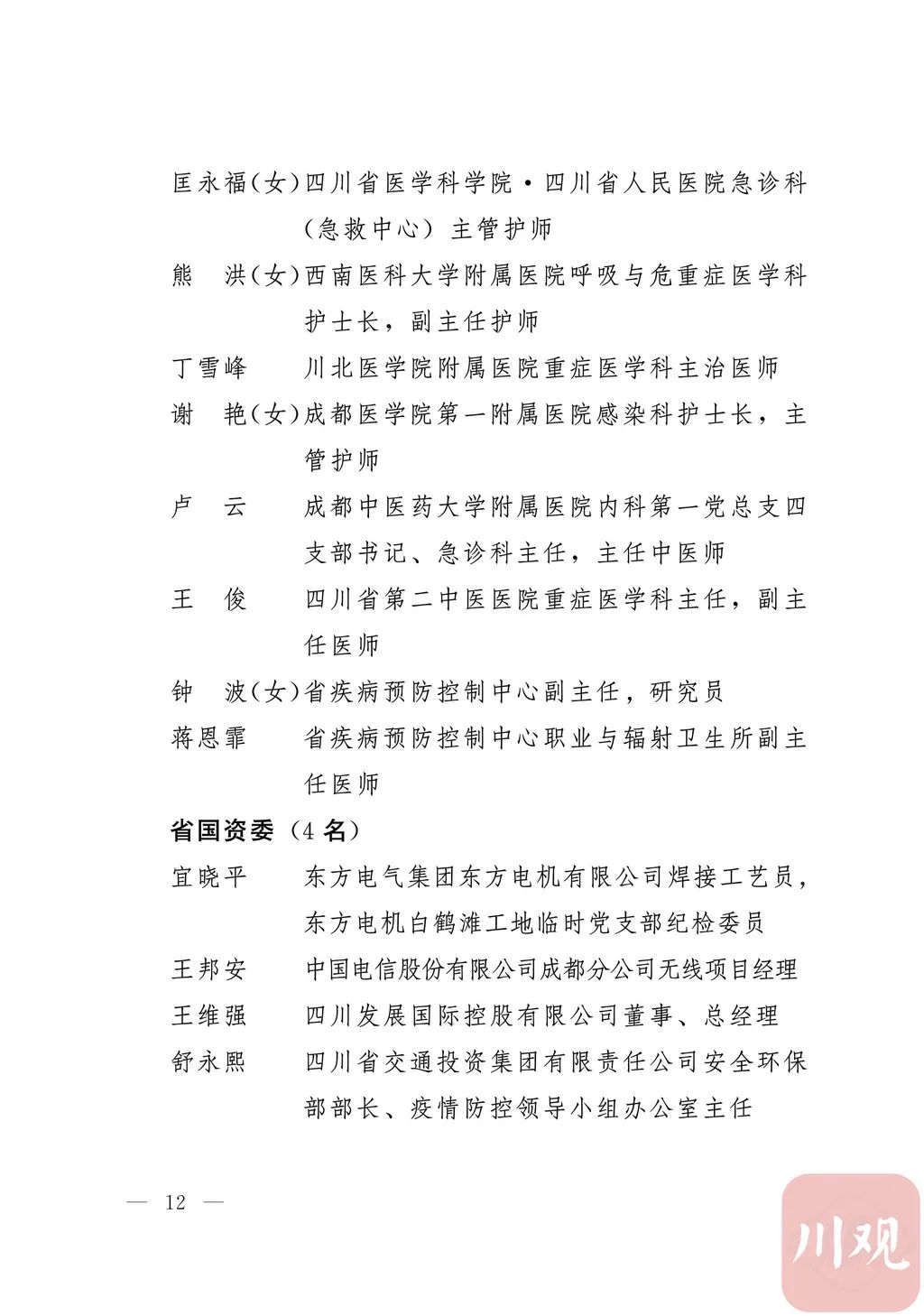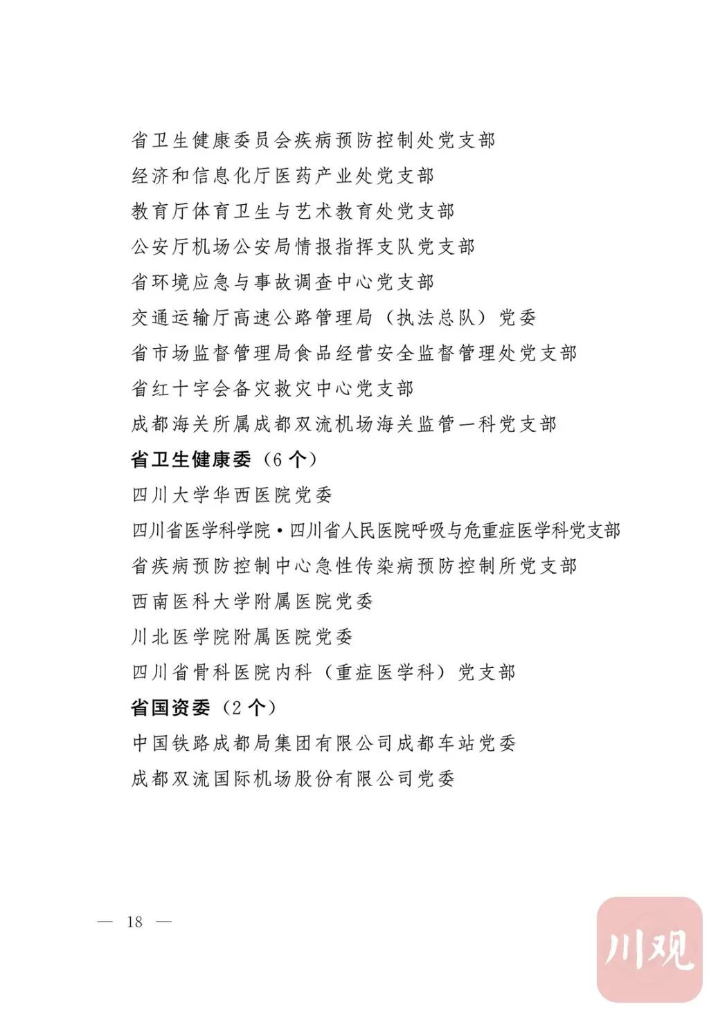 新冠肺炎疫情发生后,以习近平同志为核心的党中央统揽全局、果断决策、沉着应对,领导全党全军全国各族人民打好疫情防控的人民战争、总体战、阻击战,夺取了抗疫斗争重大战略成果。省委深入学习贯彻习近平总书记关于疫情防控工作重要讲话和重要指示批示精神,坚决贯彻党中央决策部署,团结带领全省上下认真落实坚定信心、同舟共济、科学防治、精准施策总要求,同时间赛跑,与病魔较量,凝聚起众志成城、无坚不摧的磅礴力量,疫情防控取得重大战略成果。广大基层党组织闻令而动、主动担责、守土尽责,充分发挥战斗堡垒作用,筑起守护人民生命安全和身体健康的严密防护网;广大党员挺身而出、冲锋在前,不畏生死、英勇奉献,充分发挥先锋模范作用,当好人民群众最可靠的主心骨,让鲜红的党旗在疫情防控斗争第一线高高飘扬,书写了可歌可泣、荡气回肠的壮丽篇章。为弘扬伟大抗疫精神,激励各级党组织和广大党员干部不忘初心、牢记使命,勇往直前、接续奋斗,省委决定,授予张仁卿等117名共产党员“四川省优秀共产党员”称号,追授高义泉等3名共产党员“四川省优秀共产党员”称号,授予成都市疾病预防控制中心党委等100个基层党组织“四川省先进基层党组织”称号。希望受表彰的党员和党组织珍惜荣誉、再接再厉,充分发挥模范带头作用,为党和人民事业再立新功。这次受表彰的优秀共产党员和先进基层党组织,是全省抗击新冠肺炎疫情先进个人和先进集体中的优秀代表。他们的先进事迹和崇高精神,有力彰显了中国共产党无比坚强的领导力,集中体现了中国特色社会主义制度的显著优势,鲜明昭示了党全心全意为人民服务的根本宗旨,全面反映了坚决做到“两个维护”的实际成效,充分展现了共产党人的担当和风骨。全省各级党组织和广大党员干部要以他们为榜样,学习他们信念坚定、对党忠诚的政治品质,牢记宗旨、服务群众的为民情怀,迎难而上、敢于斗争的坚定意志,恪尽职守、无私奉献的优良作风,切实增强“四个意识”、坚定“四个自信”、做到“两个维护”,始终把人民放在心中最高位置、保持同人民群众的血肉联系,关键时刻冲得上去、危难关头豁得出来、重大斗争中经得起考验,忠诚履职、团结一致,汇聚起干事创业的强大力量。当前,决胜全面建成小康社会、决战脱贫攻坚的目标任务艰巨而繁重,开启全面建设社会主义现代化国家新征程、向第二个百年奋斗目标进军的时代使命神圣而光荣。各级党组织和广大党员干部要更加紧密地团结在以习近平同志为核心的党中央周围,坚持以习近平新时代中国特色社会主义思想为指导,认真学习贯彻党的十九大和十九届二中、三中、四中、五中全会精神,深入贯彻习近平总书记对四川工作系列重要指示精神,全面落实党中央和省委决策部署,提高政治能力,保持战略定力,脚踏实地、埋头苦干,锐意进取、砥砺前行,在危机中育先机、于变局中开新局,统筹推进常态化疫情防控和经济社会发展,加快推进成渝地区双城经济圈建设,为谱写四川“十四五”发展新篇章、推动治蜀兴川再上新台阶作出新的更大贡献。四川省抗击新冠肺炎疫情优秀共产党员名单(120名)四川省抗击新冠肺炎疫情先进基层党组织名单(100个)中共四川省委