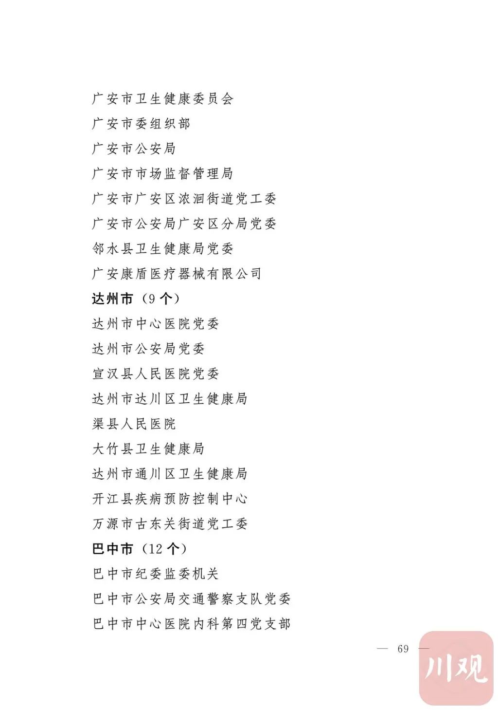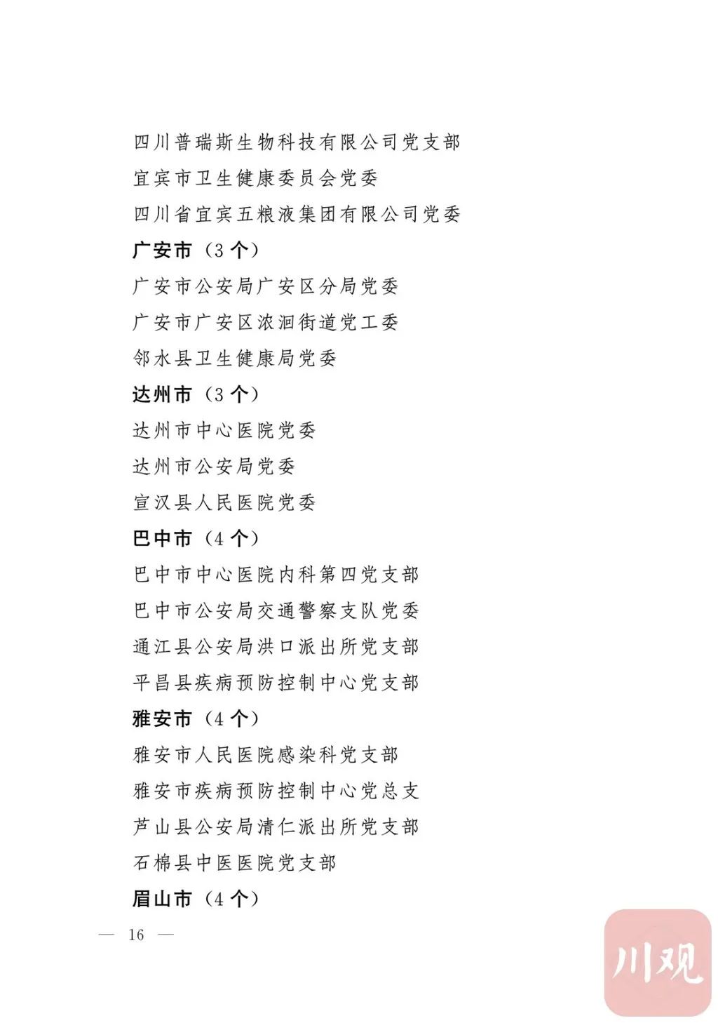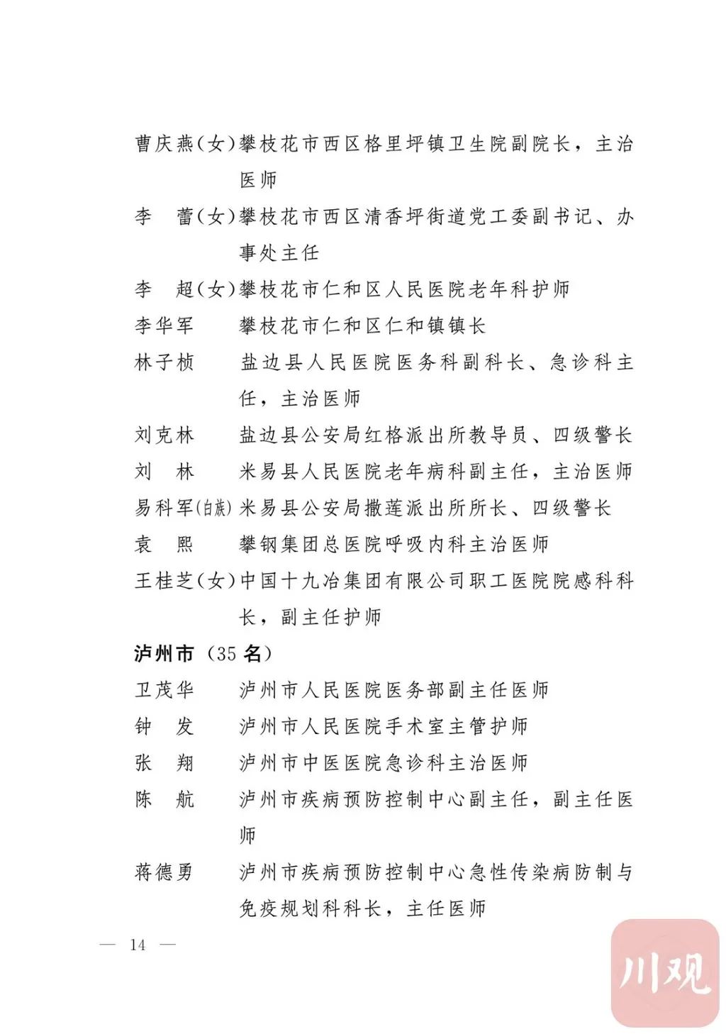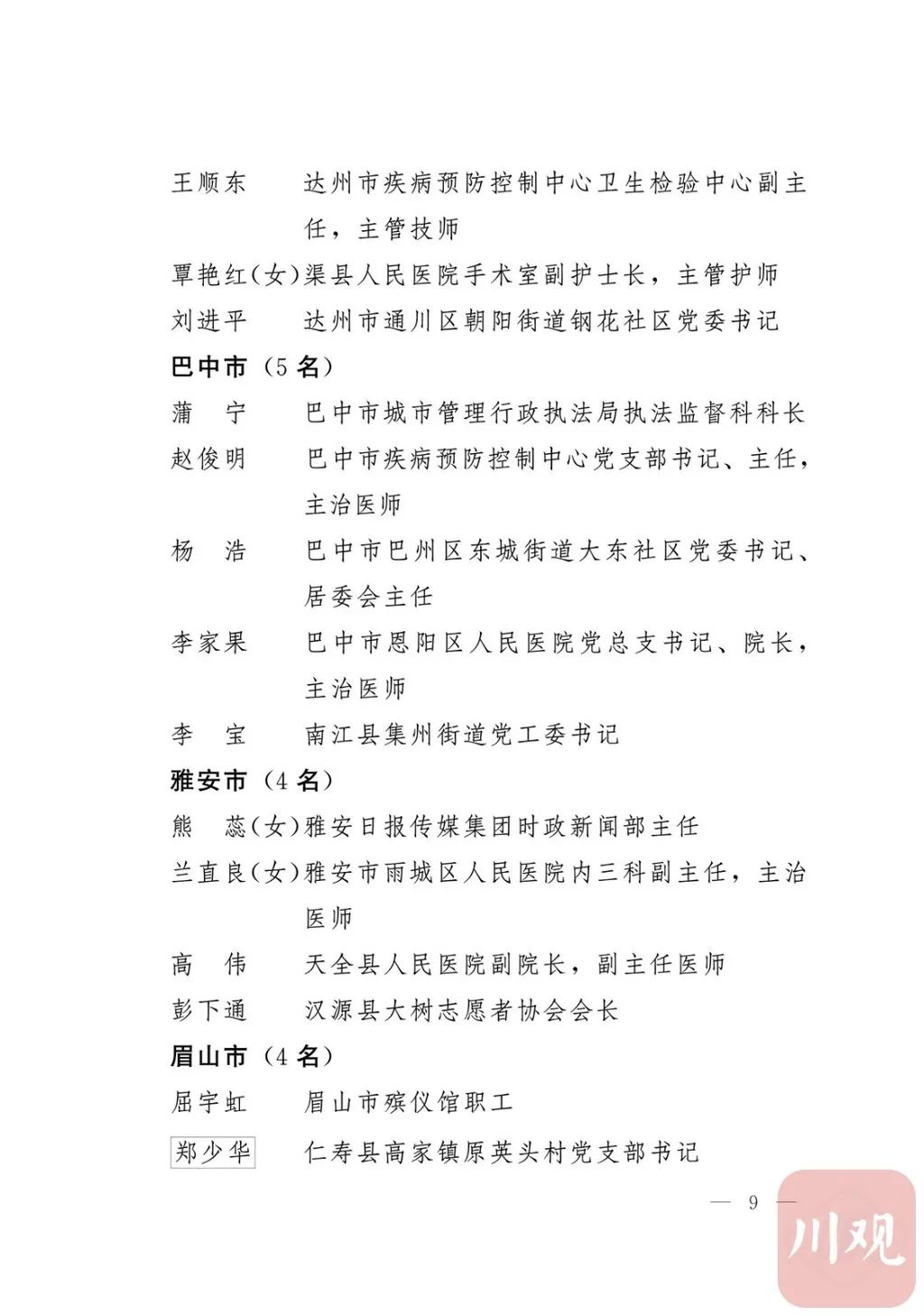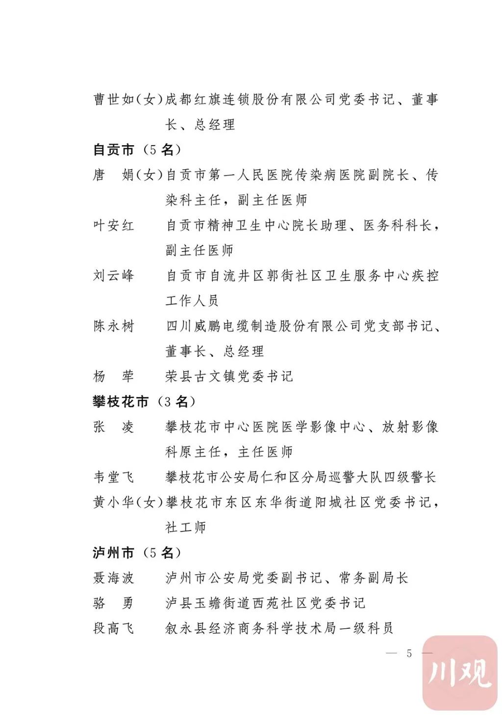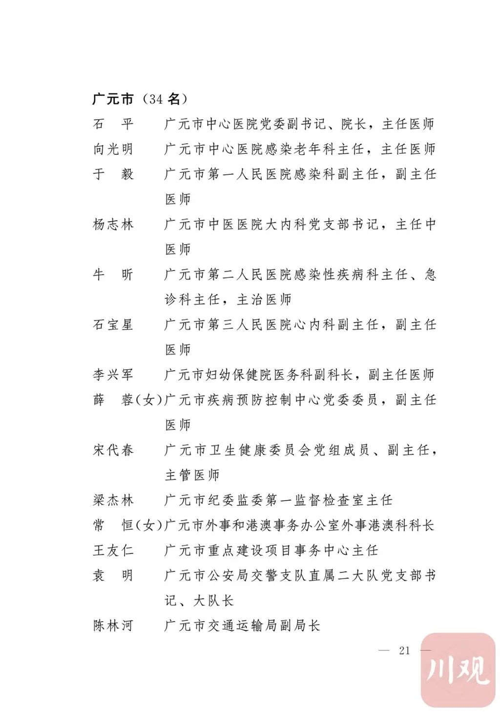 新冠肺炎疫情发生后,以习近平同志为核心的党中央统揽全局、果断决策、沉着应对,领导全党全军全国各族人民打好疫情防控的人民战争、总体战、阻击战,夺取了抗疫斗争重大战略成果。省委深入学习贯彻习近平总书记关于疫情防控工作重要讲话和重要指示批示精神,坚决贯彻党中央决策部署,团结带领全省上下认真落实坚定信心、同舟共济、科学防治、精准施策总要求,同时间赛跑,与病魔较量,凝聚起众志成城、无坚不摧的磅礴力量,疫情防控取得重大战略成果。广大基层党组织闻令而动、主动担责、守土尽责,充分发挥战斗堡垒作用,筑起守护人民生命安全和身体健康的严密防护网;广大党员挺身而出、冲锋在前,不畏生死、英勇奉献,充分发挥先锋模范作用,当好人民群众最可靠的主心骨,让鲜红的党旗在疫情防控斗争第一线高高飘扬,书写了可歌可泣、荡气回肠的壮丽篇章。为弘扬伟大抗疫精神,激励各级党组织和广大党员干部不忘初心、牢记使命,勇往直前、接续奋斗,省委决定,授予张仁卿等117名共产党员“四川省优秀共产党员”称号,追授高义泉等3名共产党员“四川省优秀共产党员”称号,授予成都市疾病预防控制中心党委等100个基层党组织“四川省先进基层党组织”称号。希望受表彰的党员和党组织珍惜荣誉、再接再厉,充分发挥模范带头作用,为党和人民事业再立新功。这次受表彰的优秀共产党员和先进基层党组织,是全省抗击新冠肺炎疫情先进个人和先进集体中的优秀代表。他们的先进事迹和崇高精神,有力彰显了中国共产党无比坚强的领导力,集中体现了中国特色社会主义制度的显著优势,鲜明昭示了党全心全意为人民服务的根本宗旨,全面反映了坚决做到“两个维护”的实际成效,充分展现了共产党人的担当和风骨。全省各级党组织和广大党员干部要以他们为榜样,学习他们信念坚定、对党忠诚的政治品质,牢记宗旨、服务群众的为民情怀,迎难而上、敢于斗争的坚定意志,恪尽职守、无私奉献的优良作风,切实增强“四个意识”、坚定“四个自信”、做到“两个维护”,始终把人民放在心中最高位置、保持同人民群众的血肉联系,关键时刻冲得上去、危难关头豁得出来、重大斗争中经得起考验,忠诚履职、团结一致,汇聚起干事创业的强大力量。当前,决胜全面建成小康社会、决战脱贫攻坚的目标任务艰巨而繁重,开启全面建设社会主义现代化国家新征程、向第二个百年奋斗目标进军的时代使命神圣而光荣。各级党组织和广大党员干部要更加紧密地团结在以习近平同志为核心的党中央周围,坚持以习近平新时代中国特色社会主义思想为指导,认真学习贯彻党的十九大和十九届二中、三中、四中、五中全会精神,深入贯彻习近平总书记对四川工作系列重要指示精神,全面落实党中央和省委决策部署,提高政治能力,保持战略定力,脚踏实地、埋头苦干,锐意进取、砥砺前行,在危机中育先机、于变局中开新局,统筹推进常态化疫情防控和经济社会发展,加快推进成渝地区双城经济圈建设,为谱写四川“十四五”发展新篇章、推动治蜀兴川再上新台阶作出新的更大贡献。四川省抗击新冠肺炎疫情优秀共产党员名单(120名)四川省抗击新冠肺炎疫情先进基层党组织名单(100个)中共四川省委