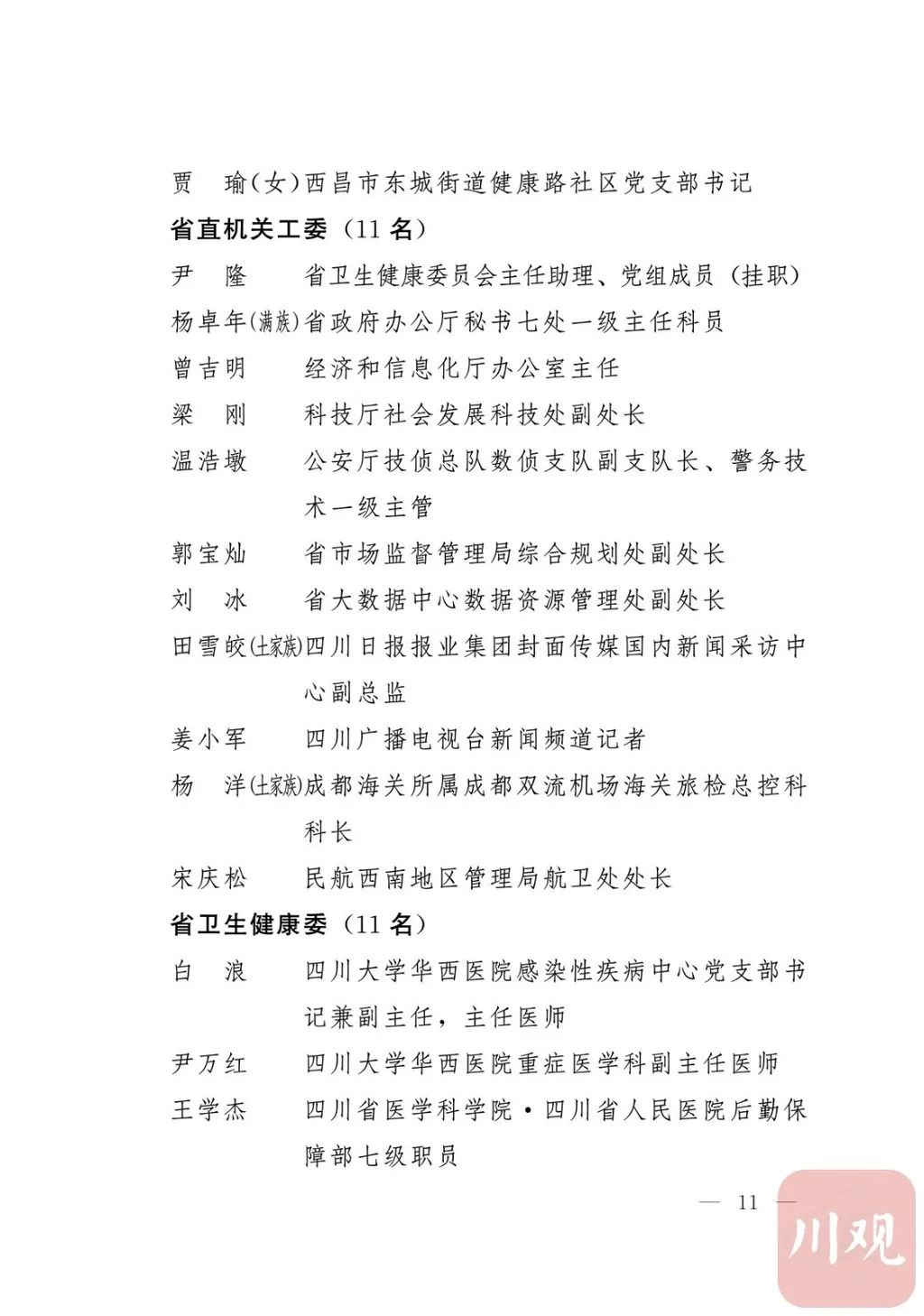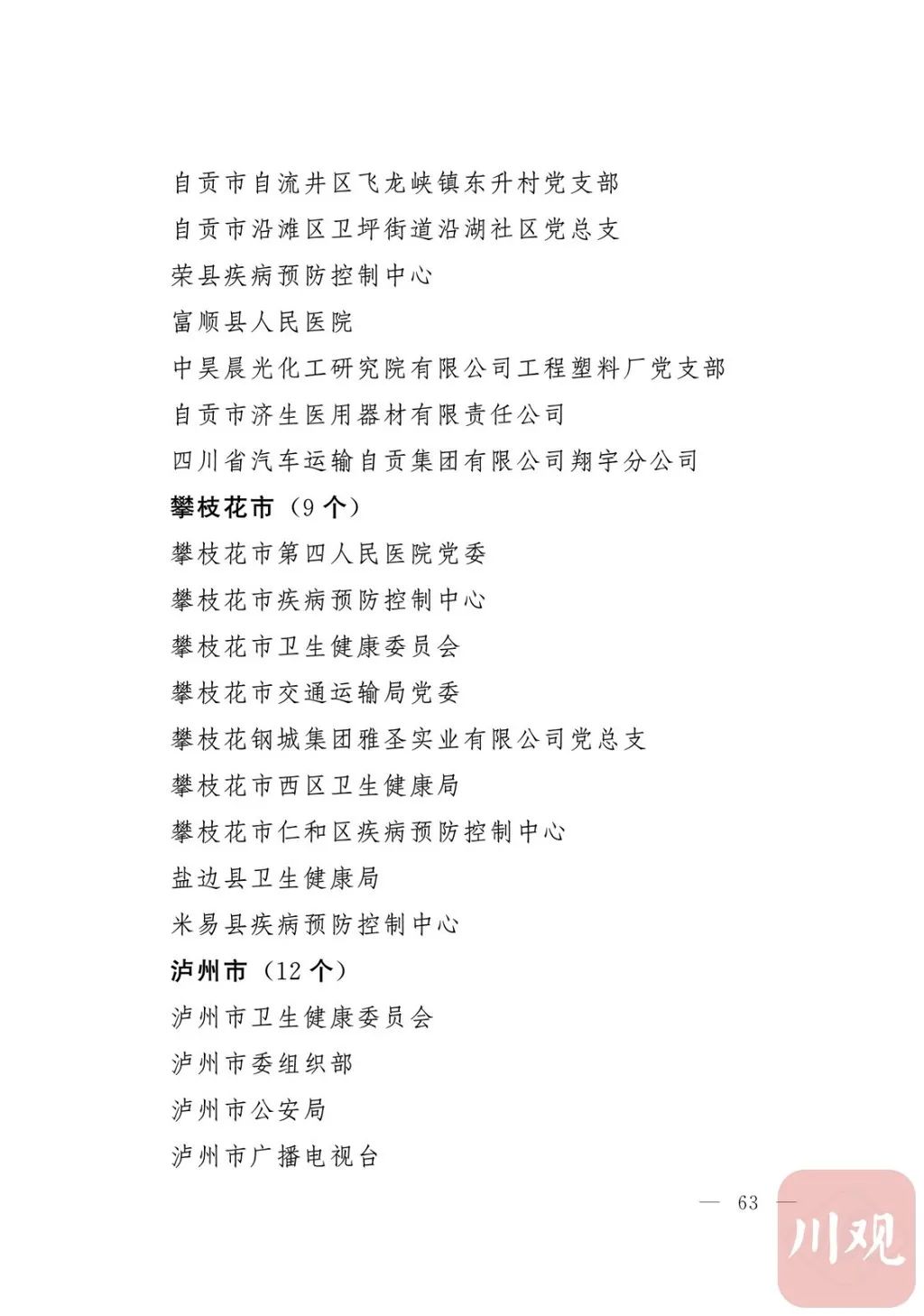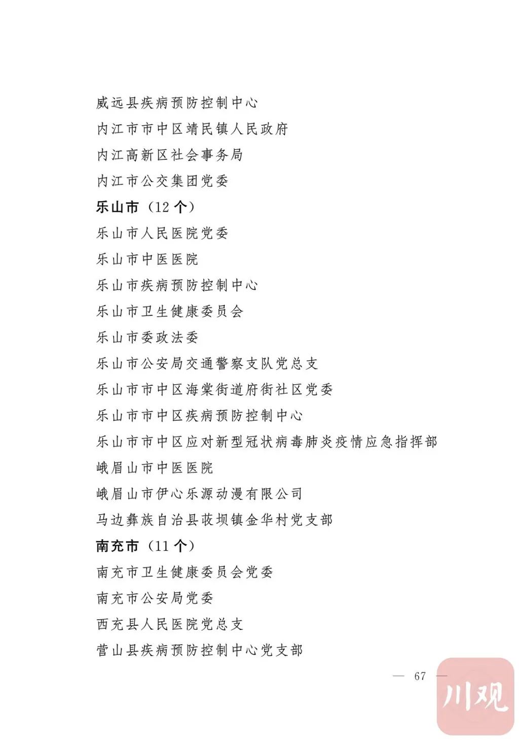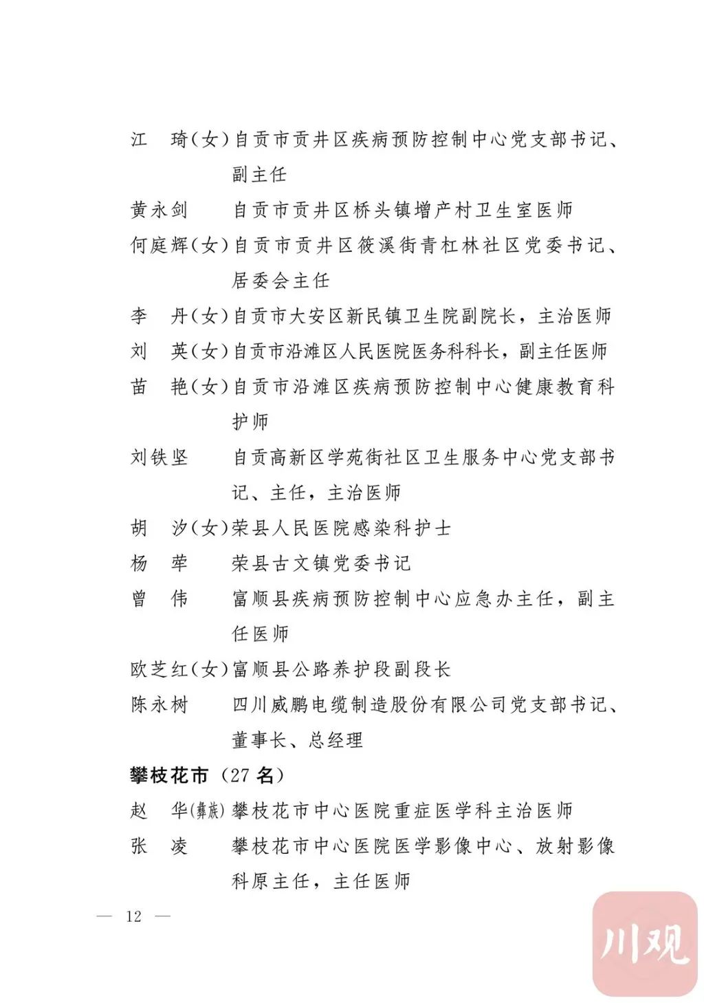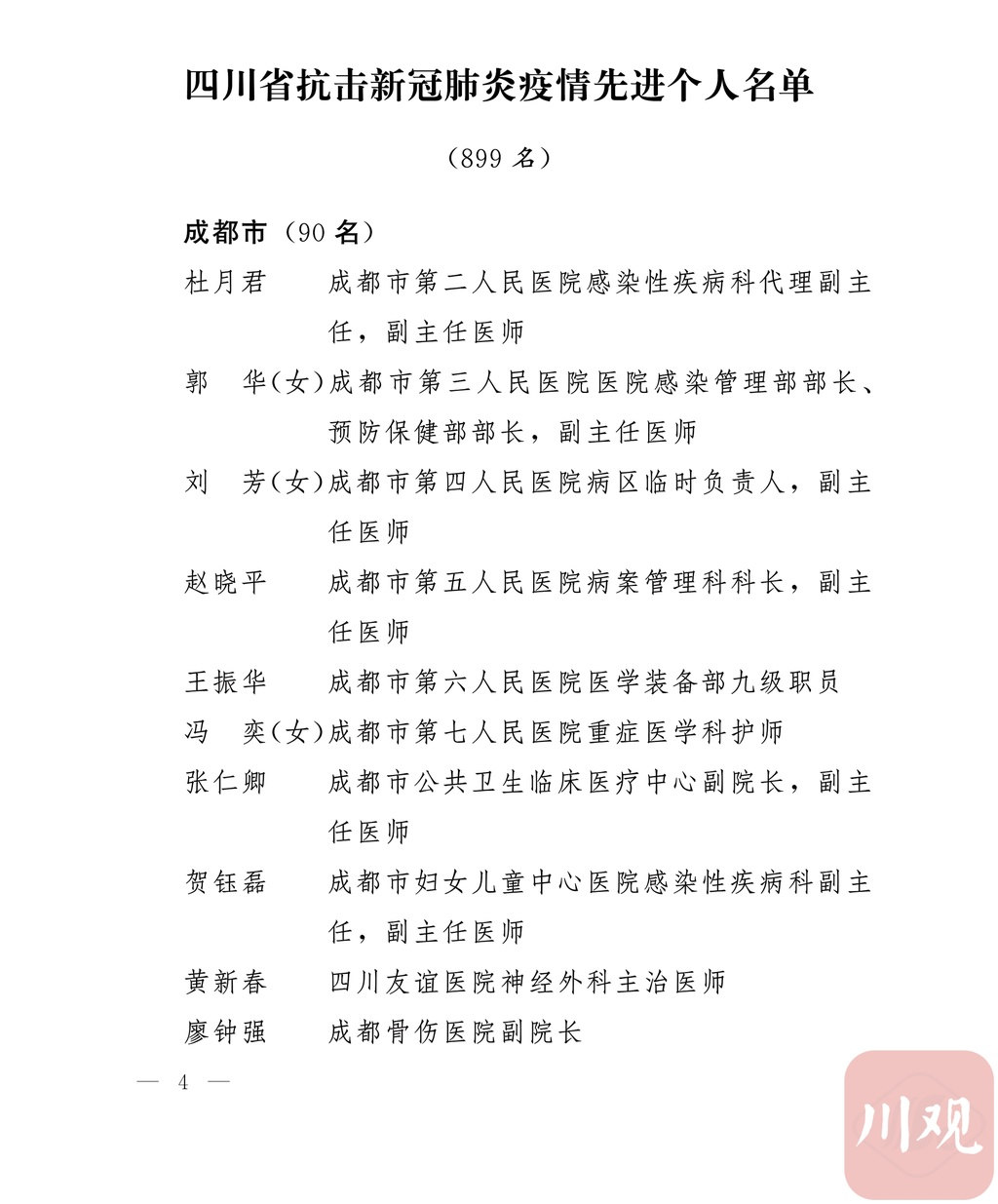 新冠肺炎疫情发生后,以习近平同志为核心的党中央统揽全局、果断决策、沉着应对,领导全党全军全国各族人民打好疫情防控的人民战争、总体战、阻击战,夺取了抗疫斗争重大战略成果。省委深入学习贯彻习近平总书记关于疫情防控工作重要讲话和重要指示批示精神,坚决贯彻党中央决策部署,团结带领全省上下认真落实坚定信心、同舟共济、科学防治、精准施策总要求,同时间赛跑,与病魔较量,凝聚起众志成城、无坚不摧的磅礴力量,疫情防控取得重大战略成果。广大基层党组织闻令而动、主动担责、守土尽责,充分发挥战斗堡垒作用,筑起守护人民生命安全和身体健康的严密防护网;广大党员挺身而出、冲锋在前,不畏生死、英勇奉献,充分发挥先锋模范作用,当好人民群众最可靠的主心骨,让鲜红的党旗在疫情防控斗争第一线高高飘扬,书写了可歌可泣、荡气回肠的壮丽篇章。为弘扬伟大抗疫精神,激励各级党组织和广大党员干部不忘初心、牢记使命,勇往直前、接续奋斗,省委决定,授予张仁卿等117名共产党员“四川省优秀共产党员”称号,追授高义泉等3名共产党员“四川省优秀共产党员”称号,授予成都市疾病预防控制中心党委等100个基层党组织“四川省先进基层党组织”称号。希望受表彰的党员和党组织珍惜荣誉、再接再厉,充分发挥模范带头作用,为党和人民事业再立新功。这次受表彰的优秀共产党员和先进基层党组织,是全省抗击新冠肺炎疫情先进个人和先进集体中的优秀代表。他们的先进事迹和崇高精神,有力彰显了中国共产党无比坚强的领导力,集中体现了中国特色社会主义制度的显著优势,鲜明昭示了党全心全意为人民服务的根本宗旨,全面反映了坚决做到“两个维护”的实际成效,充分展现了共产党人的担当和风骨。全省各级党组织和广大党员干部要以他们为榜样,学习他们信念坚定、对党忠诚的政治品质,牢记宗旨、服务群众的为民情怀,迎难而上、敢于斗争的坚定意志,恪尽职守、无私奉献的优良作风,切实增强“四个意识”、坚定“四个自信”、做到“两个维护”,始终把人民放在心中最高位置、保持同人民群众的血肉联系,关键时刻冲得上去、危难关头豁得出来、重大斗争中经得起考验,忠诚履职、团结一致,汇聚起干事创业的强大力量。当前,决胜全面建成小康社会、决战脱贫攻坚的目标任务艰巨而繁重,开启全面建设社会主义现代化国家新征程、向第二个百年奋斗目标进军的时代使命神圣而光荣。各级党组织和广大党员干部要更加紧密地团结在以习近平同志为核心的党中央周围,坚持以习近平新时代中国特色社会主义思想为指导,认真学习贯彻党的十九大和十九届二中、三中、四中、五中全会精神,深入贯彻习近平总书记对四川工作系列重要指示精神,全面落实党中央和省委决策部署,提高政治能力,保持战略定力,脚踏实地、埋头苦干,锐意进取、砥砺前行,在危机中育先机、于变局中开新局,统筹推进常态化疫情防控和经济社会发展,加快推进成渝地区双城经济圈建设,为谱写四川“十四五”发展新篇章、推动治蜀兴川再上新台阶作出新的更大贡献。四川省抗击新冠肺炎疫情优秀共产党员名单(120名)四川省抗击新冠肺炎疫情先进基层党组织名单(100个)中共四川省委