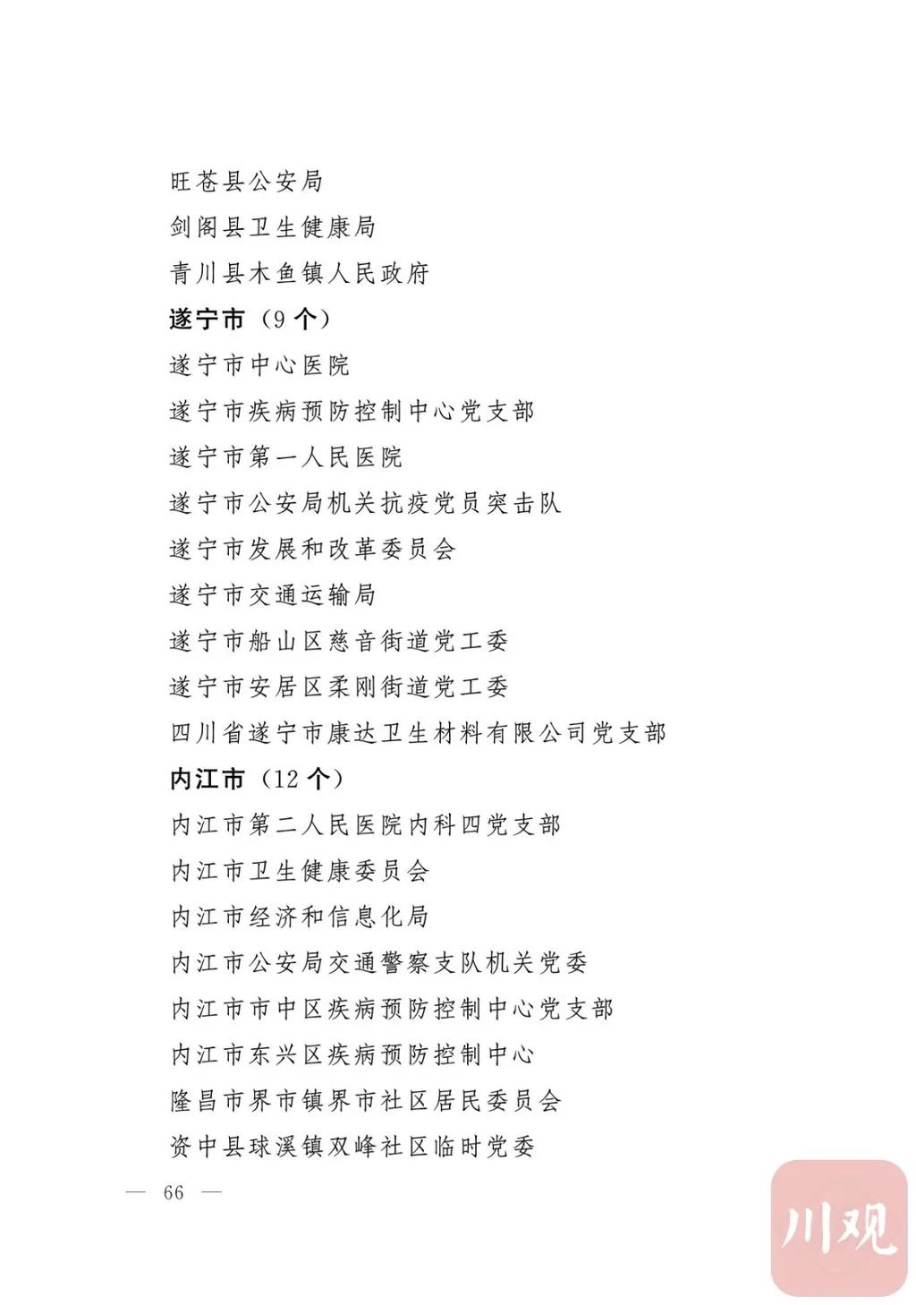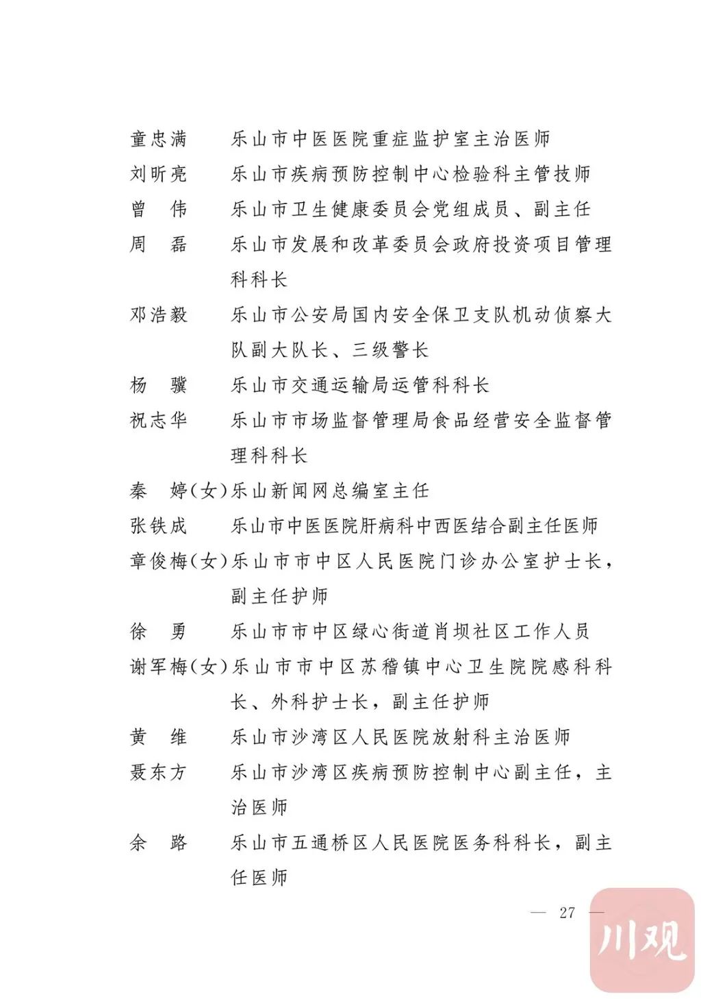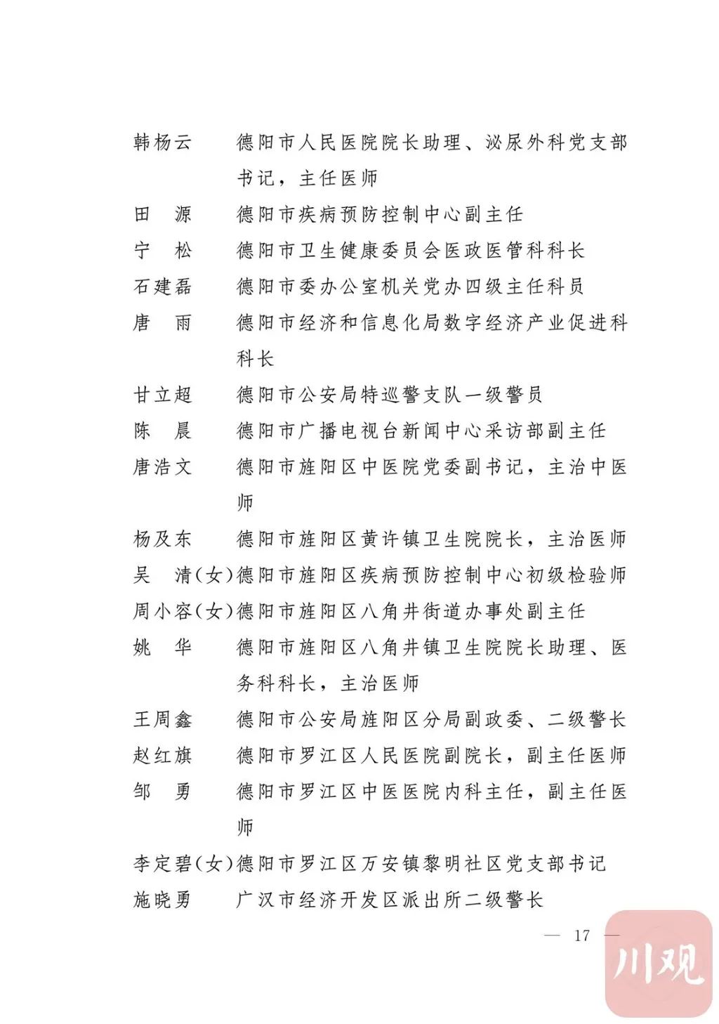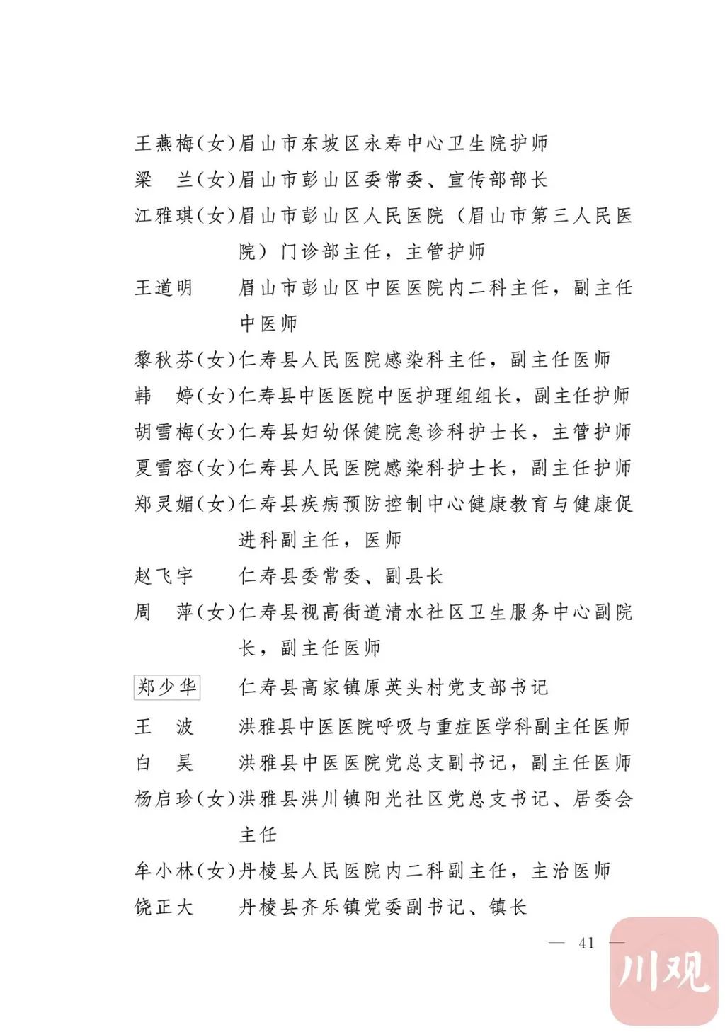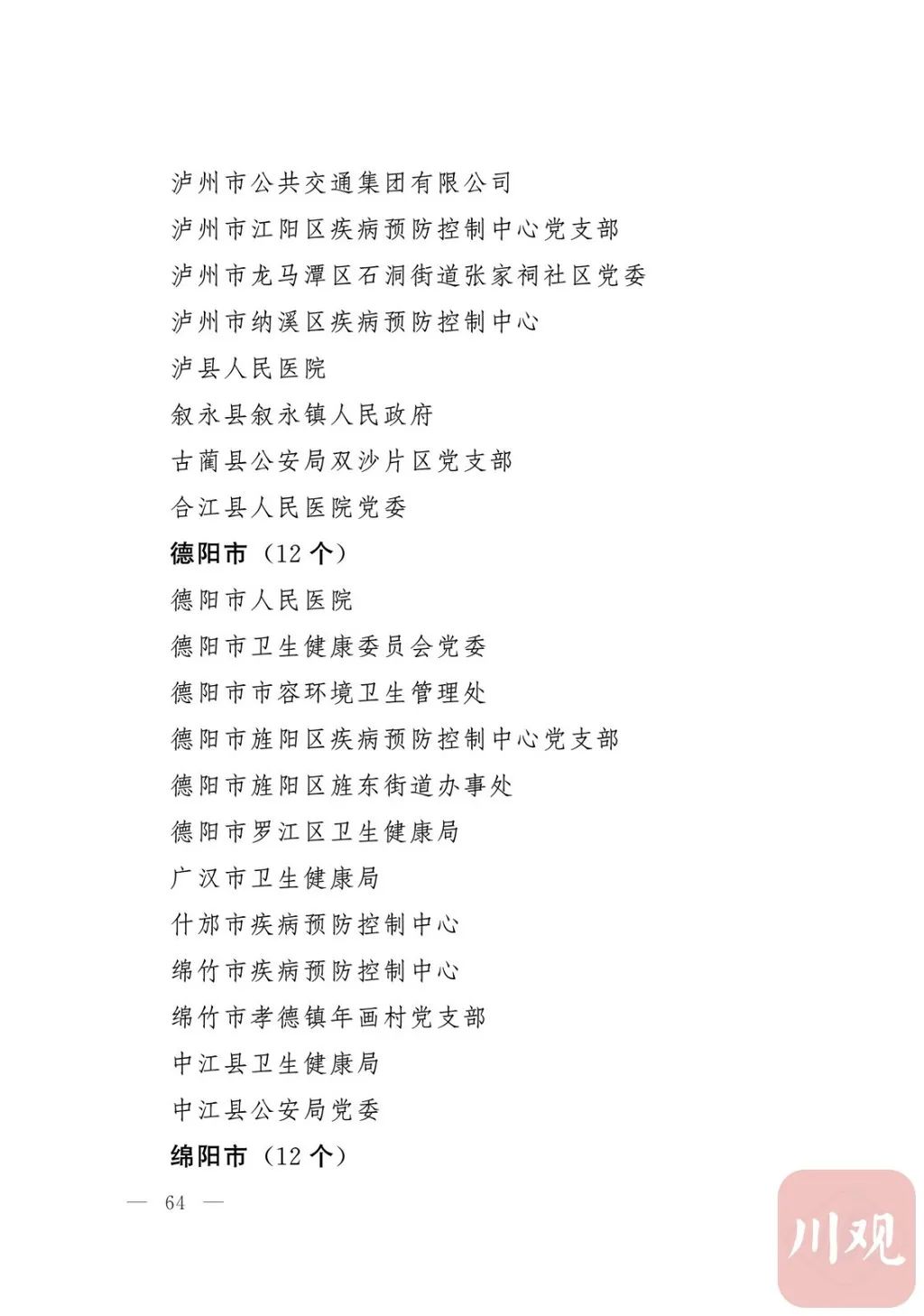新冠肺炎疫情发生后,以习近平同志为核心的党中央统揽全局、果断决策、沉着应对,领导全党全军全国各族人民打好疫情防控的人民战争、总体战、阻击战,夺取了抗疫斗争重大战略成果。省委深入学习贯彻习近平总书记关于疫情防控工作重要讲话和重要指示批示精神,坚决贯彻党中央决策部署,团结带领全省上下认真落实坚定信心、同舟共济、科学防治、精准施策总要求,同时间赛跑,与病魔较量,凝聚起众志成城、无坚不摧的磅礴力量,疫情防控取得重大战略成果。广大基层党组织闻令而动、主动担责、守土尽责,充分发挥战斗堡垒作用,筑起守护人民生命安全和身体健康的严密防护网;广大党员挺身而出、冲锋在前,不畏生死、英勇奉献,充分发挥先锋模范作用,当好人民群众最可靠的主心骨,让鲜红的党旗在疫情防控斗争第一线高高飘扬,书写了可歌可泣、荡气回肠的壮丽篇章。为弘扬伟大抗疫精神,激励各级党组织和广大党员干部不忘初心、牢记使命,勇往直前、接续奋斗,省委决定,授予张仁卿等117名共产党员“四川省优秀共产党员”称号,追授高义泉等3名共产党员“四川省优秀共产党员”称号,授予成都市疾病预防控制中心党委等100个基层党组织“四川省先进基层党组织”称号。希望受表彰的党员和党组织珍惜荣誉、再接再厉,充分发挥模范带头作用,为党和人民事业再立新功。这次受表彰的优秀共产党员和先进基层党组织,是全省抗击新冠肺炎疫情先进个人和先进集体中的优秀代表。他们的先进事迹和崇高精神,有力彰显了中国共产党无比坚强的领导力,集中体现了中国特色社会主义制度的显著优势,鲜明昭示了党全心全意为人民服务的根本宗旨,全面反映了坚决做到“两个维护”的实际成效,充分展现了共产党人的担当和风骨。全省各级党组织和广大党员干部要以他们为榜样,学习他们信念坚定、对党忠诚的政治品质,牢记宗旨、服务群众的为民情怀,迎难而上、敢于斗争的坚定意志,恪尽职守、无私奉献的优良作风,切实增强“四个意识”、坚定“四个自信”、做到“两个维护”,始终把人民放在心中最高位置、保持同人民群众的血肉联系,关键时刻冲得上去、危难关头豁得出来、重大斗争中经得起考验,忠诚履职、团结一致,汇聚起干事创业的强大力量。当前,决胜全面建成小康社会、决战脱贫攻坚的目标任务艰巨而繁重,开启全面建设社会主义现代化国家新征程、向第二个百年奋斗目标进军的时代使命神圣而光荣。各级党组织和广大党员干部要更加紧密地团结在以习近平同志为核心的党中央周围,坚持以习近平新时代中国特色社会主义思想为指导,认真学习贯彻党的十九大和十九届二中、三中、四中、五中全会精神,深入贯彻习近平总书记对四川工作系列重要指示精神,全面落实党中央和省委决策部署,提高政治能力,保持战略定力,脚踏实地、埋头苦干,锐意进取、砥砺前行,在危机中育先机、于变局中开新局,统筹推进常态化疫情防控和经济社会发展,加快推进成渝地区双城经济圈建设,为谱写四川“十四五”发展新篇章、推动治蜀兴川再上新台阶作出新的更大贡献。四川省抗击新冠肺炎疫情优秀共产党员名单(120名)四川省抗击新冠肺炎疫情先进基层党组织名单(100个)中共四川省委