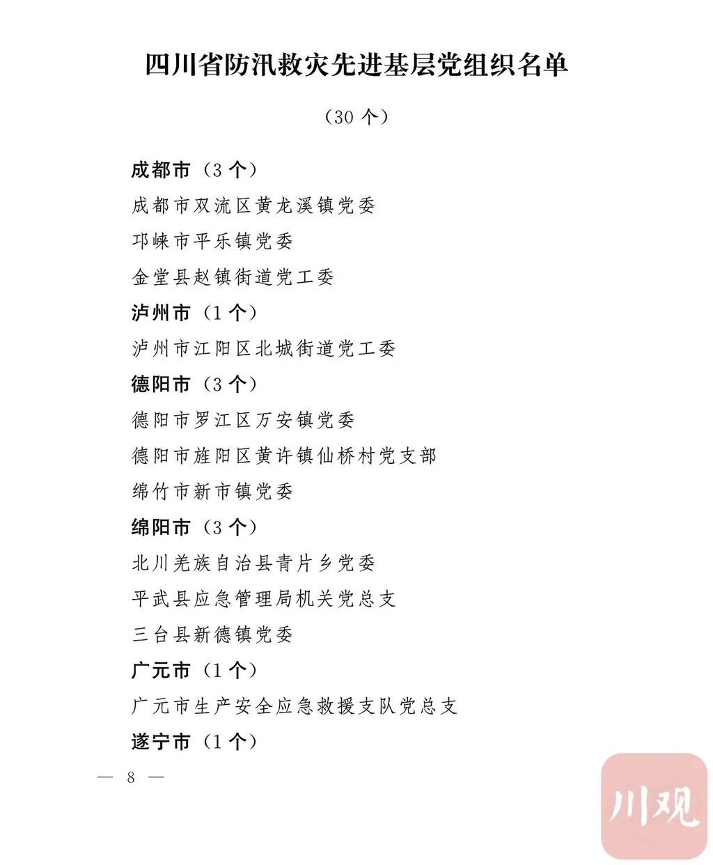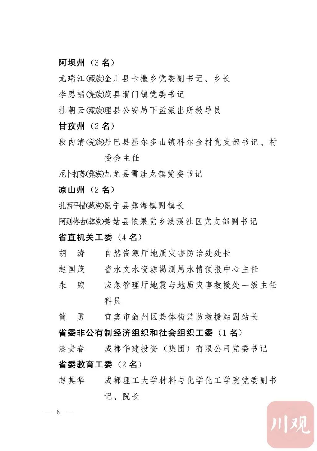 今年入汛以来,我省遭遇严重洪涝灾害,降雨强度、流域水情和新增地质灾害屡超历史记录,特别是“8·11”“8·18”两轮历史罕见的极端持续暴雨天气过程中,江河洪水、山洪、泥石流、城市内涝等灾害接连暴发,人民群众生命财产安全受到严重威胁。面对重大险情灾情,各级党组织和广大党员干部坚决贯彻习近平总书记关于防灾减灾救灾重要指示批示精神,认真落实党中央和省委决策部署,坚持人民至上、生命至上,以汛为令、冲锋在前,全力以赴打赢了防汛减灾、安全度汛这场硬仗,涌现出一大批先进典型。为激励先进、鼓舞士气,省委决定,授予陈奎安等50名共产党员“四川省优秀共产党员”称号,授予成都市双流区黄龙溪镇党委等30个基层党组织“四川省先进基层党组织”称号。希望受表彰的党员和党组织珍惜荣誉,充分发挥先锋引领作用,始终保持奋发有为的精神状态,努力在新的起点上展现新担当新作为。各级党组织和广大党员干部要以受表彰的先进典型为榜样,坚持以习近平新时代中国特色社会主义思想为指导,深入学习贯彻习近平总书记关于防灾减灾救灾重要指示批示精神,坚决落实党中央和省委决策部署,牢记初心使命,践行党的宗旨,始终把人民群众利益放在首位,深刻认识防灾减灾救灾工作的极端重要性,树立底线思维,增强忧患意识,立足防大汛、抗大旱、抢大险、救大灾,持续提升防灾减灾救灾能力,以高度的政治责任感防范化解风险隐患,坚决维护人民群众生命财产安全和社会稳定,统筹推进常态化疫情防控和经济社会发展各项工作,为加快推进成渝地区双城经济圈建设、推动治蜀兴川再上新台阶作出新的更大贡献。