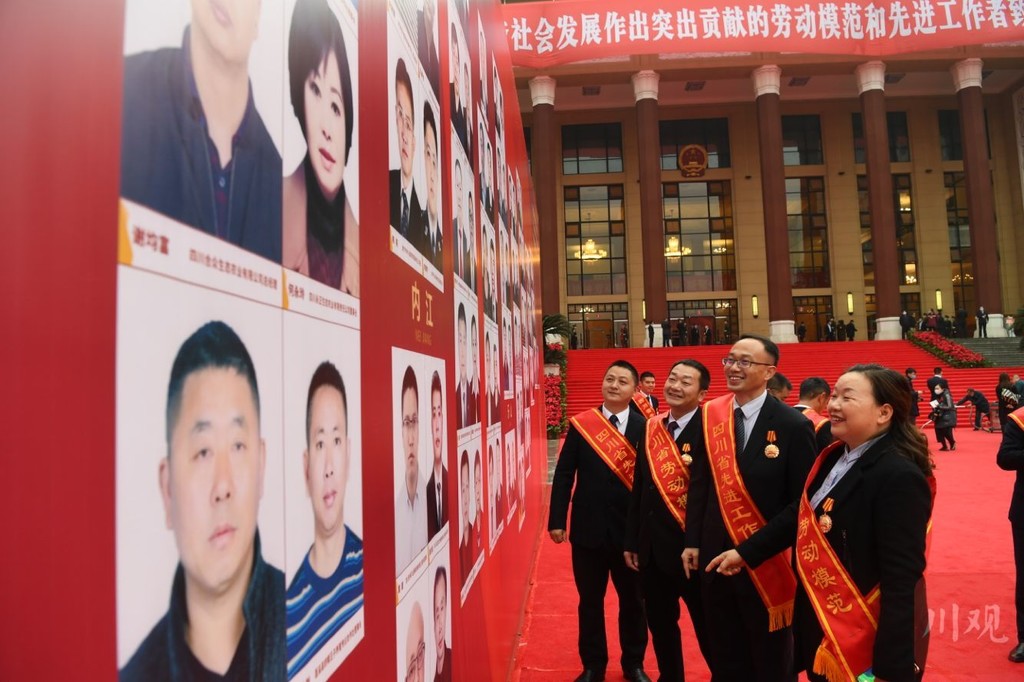 “这些都是我们提前很久就开始准备的。”现在负责场馆布置的工作人员向川观新闻记者介绍,为了让每一位劳模和先进的头像和事迹都能够清晰地展示在光荣墙上,在制作墙上的展布时候,特地制作了两幅没有切割过的展布,“直接一次成型,很有质感。”