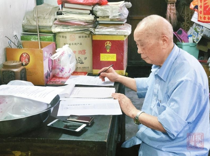 2019年7月3日,周永开在书桌前准备党课内容。平日里,他在这书桌前看书、读报,常常一坐就是一整天。 四川在线记者 徐莉莎 摄