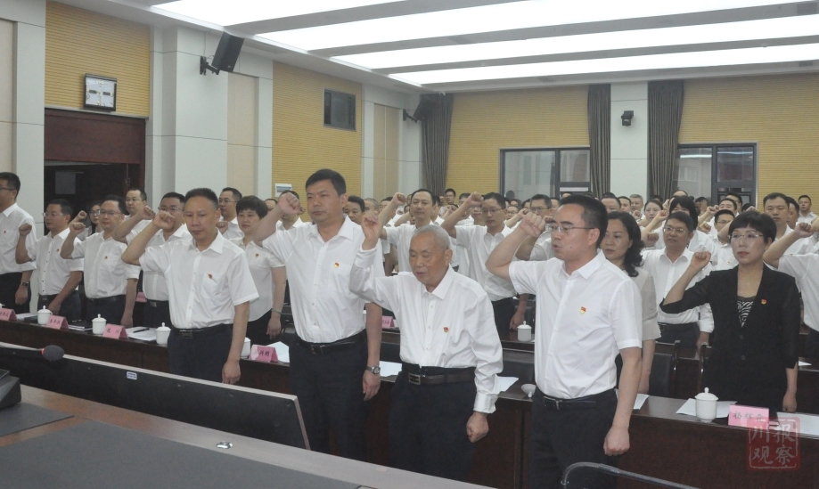 2019年7月4日,达州市纪委监委小礼堂。鲜红党旗下,91岁老党员周永开庄严地举起右手,与百名纪检干部一起重温入党誓词。周永开挺直腰身,目光坚定,胸前的党徽熠熠生辉。