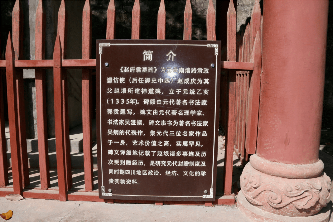 赵成庆的父亲赵垠于成宗大德年间(1297年)去世,葬于“郪县富国乡之东山”(今北坝镇东林村石马湾),那一年,赵成庆13岁,赵成庆在母亲和兄长的照顾下长大。约在1334年,赵成庆升任云南诸道肃政亷访使(正三品)。在赴云南上任前,他回到家乡,在他父亲坟前立了一块碑,即《元赵府君墓碑》。碑文由当时著名理学家、经学家、教育家吴澄撰写,文中介绍了他父亲赵垠的生平事迹。碑首篆书作者郭贯和碑身隶书作者吴炳都是元朝大书法家。因该碑集元代三大名家作品于一身,非常罕见,被称之为“三绝碑”。1993年被评为国家一级文物,现存放于琴泉寺内。赵成庆为父亲立碑,是“以表上之恩,以章亲之荣”,其实也是在彰显孝道。