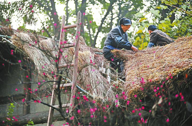 铺草是最难的,将茅草用铡刀切齐,捆绑固定后扔到房上,从檐檩循序往房顶上铺草,层层铺开,再用梳板依次向下排打,让茅草铺盖均匀、有序。“这个步骤最考工艺,没有技术是铺不好的。”刘瑞寅说。修得好的茅屋,层次分明,斜面光滑,边沿整整齐齐。