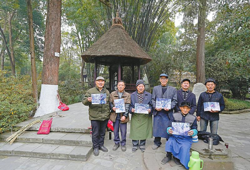 1月24日,周礼春(左一)和老伙计们在成都杜甫草堂茅屋修缮完工后合影,大家手中拿着的照片是他们6年前在草堂修缮茅屋时的场景照。