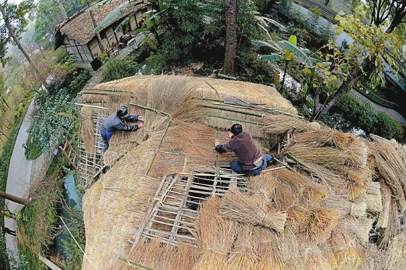 为了保持茅屋的质量和效果,换草修葺仍由当年的盖匠进行。2005年,杜甫草堂茅屋整体换草,周礼春再次跟随父亲来到草堂。后来每逢茅屋修葺,周礼春都参与其中。技术慢慢熟练,他逐渐也能独当一面。2015年,杜甫草堂再次整体换草,周礼春领头接下了这个任务。