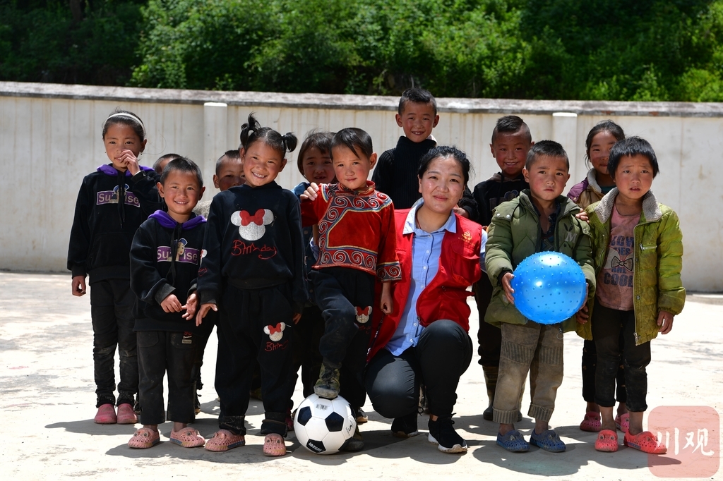这是杨卓玛跟村里幼儿园小朋友在一起。(2019年6月摄)