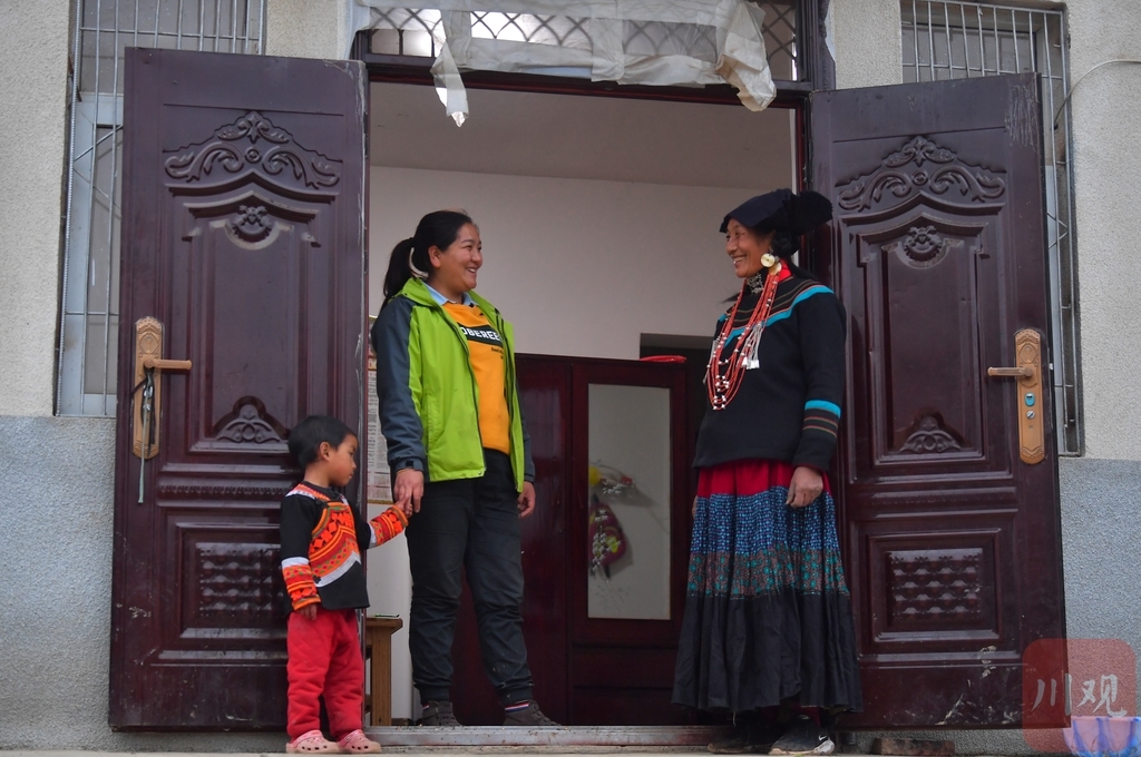 这是杨卓玛和贫困户在新居前聊天。(2021年1月摄)