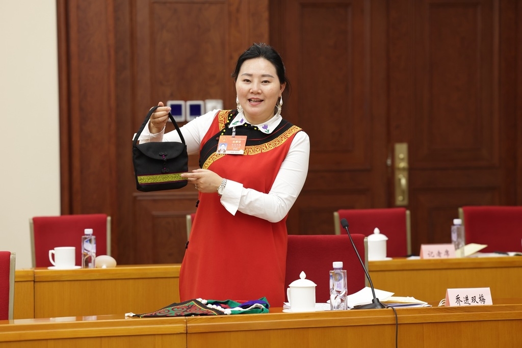 乔进双梅代表在小组发言时展示彝绣作品,讲述带领彝族妇女传承民族手工艺,脱贫致富的故事。