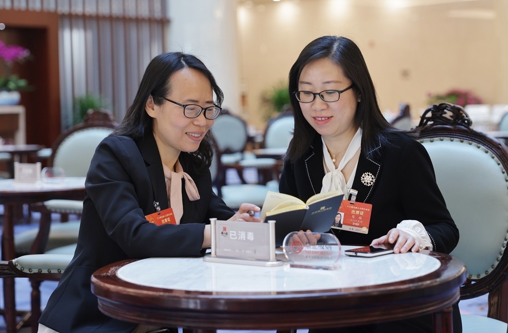 符宇航代表(左)与陈琳代表(右)就科技创新问题进行交流。