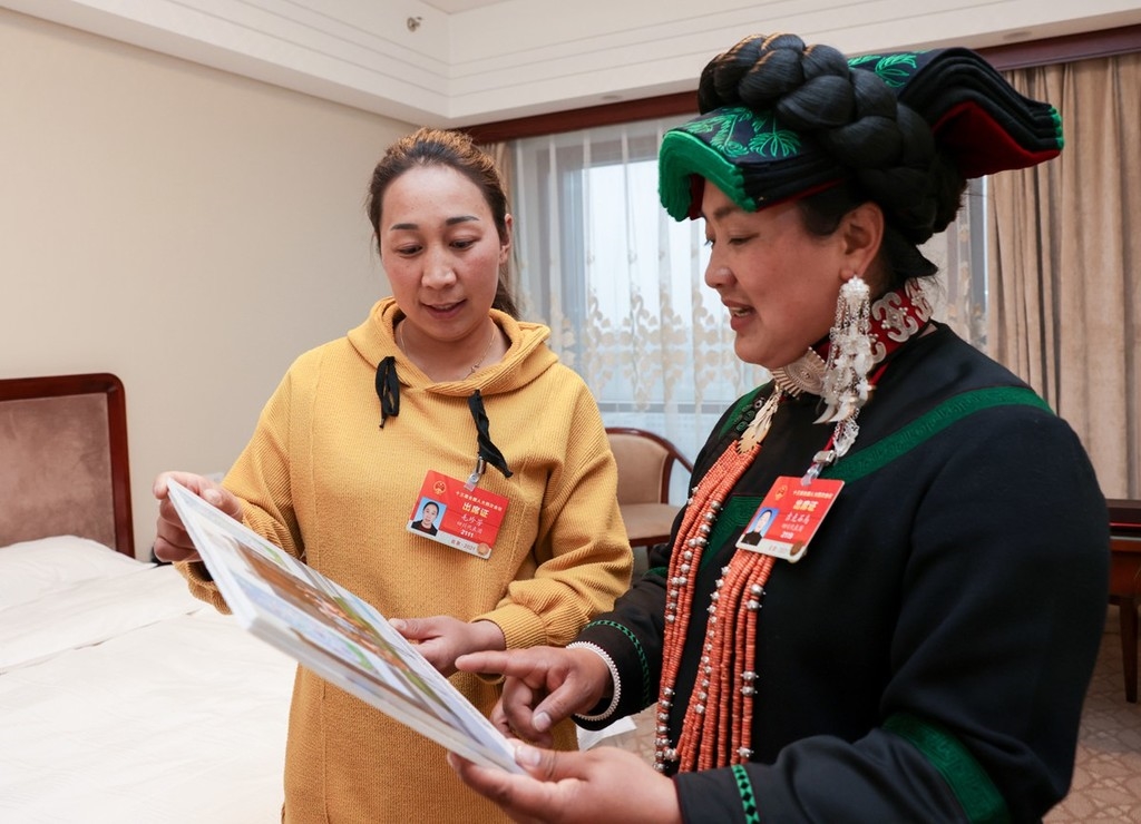 吉克石乌代表(右)向毛珍芳代表(左)展示反映凉山脱贫后新面貌的照片,分享脱贫致富的喜悦。