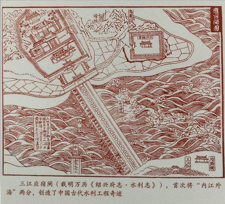 《三江应宿闸图》载明万历《绍兴府志》。该闸首次把江海两分,创造了中国古代水利工程奇迹