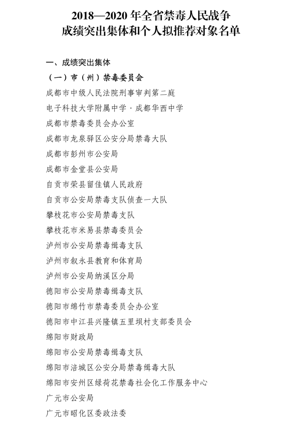 3月31日,四川在线记者从省禁毒办获悉,省禁毒委员会决定对一批“2018—2020年全省禁毒人民战争”成绩突出集体和个人予以通报表扬,现依程序进行公示。