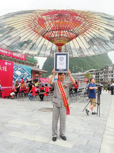 在广西桂林市阳朔县,毕六福举着一张最大油纸伞吉尼斯世界纪录称号的证书,背后是一把直径16.2米高、重达750斤的油纸伞。 毕原绅供图