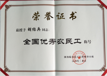 胡绍兵,四川省泸县牛滩镇新林村返乡农民工,泸州沱江液压件有限公司工人,高级焊工。2017年荣获泸县牛滩镇“优秀共产党员”称号,2018年被评为泸州沱江液压件有限公司“质量标兵”、“优秀员工”,荣获泸县首届“中国梦·劳动美”最美职工称号,2019年荣获“建设泸县贡献奖”“泸州市劳动模范”称号,2020年,荣获“四川省劳动模范”“全国优秀农民工”称号。