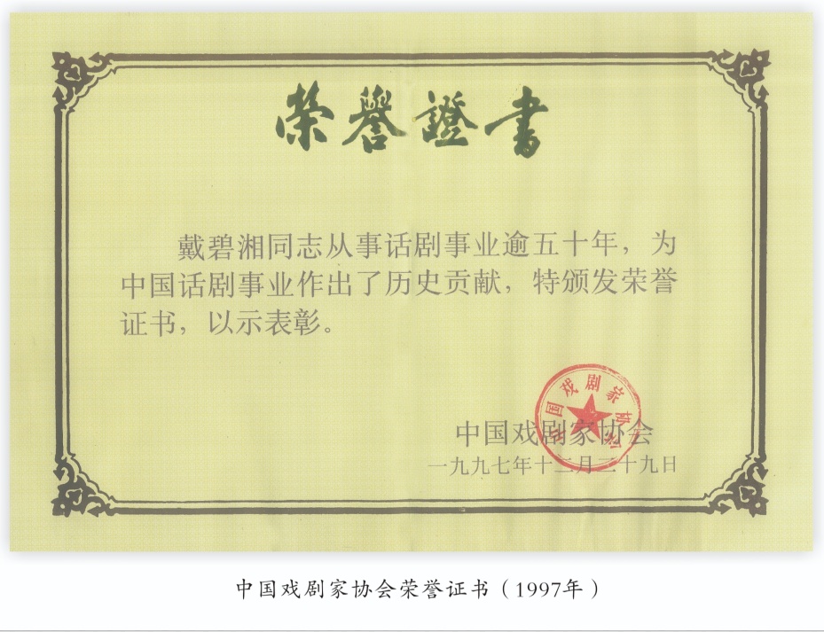 1997年,中国戏剧家协会为戴碧湘颁发的从事话剧逾五十年的荣誉证书