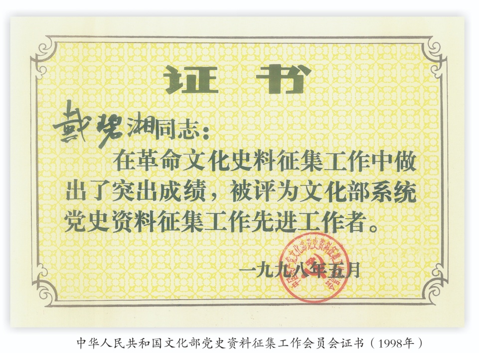 1998年,文化部党史资料征集工作委员会给戴碧湘颁发的证书