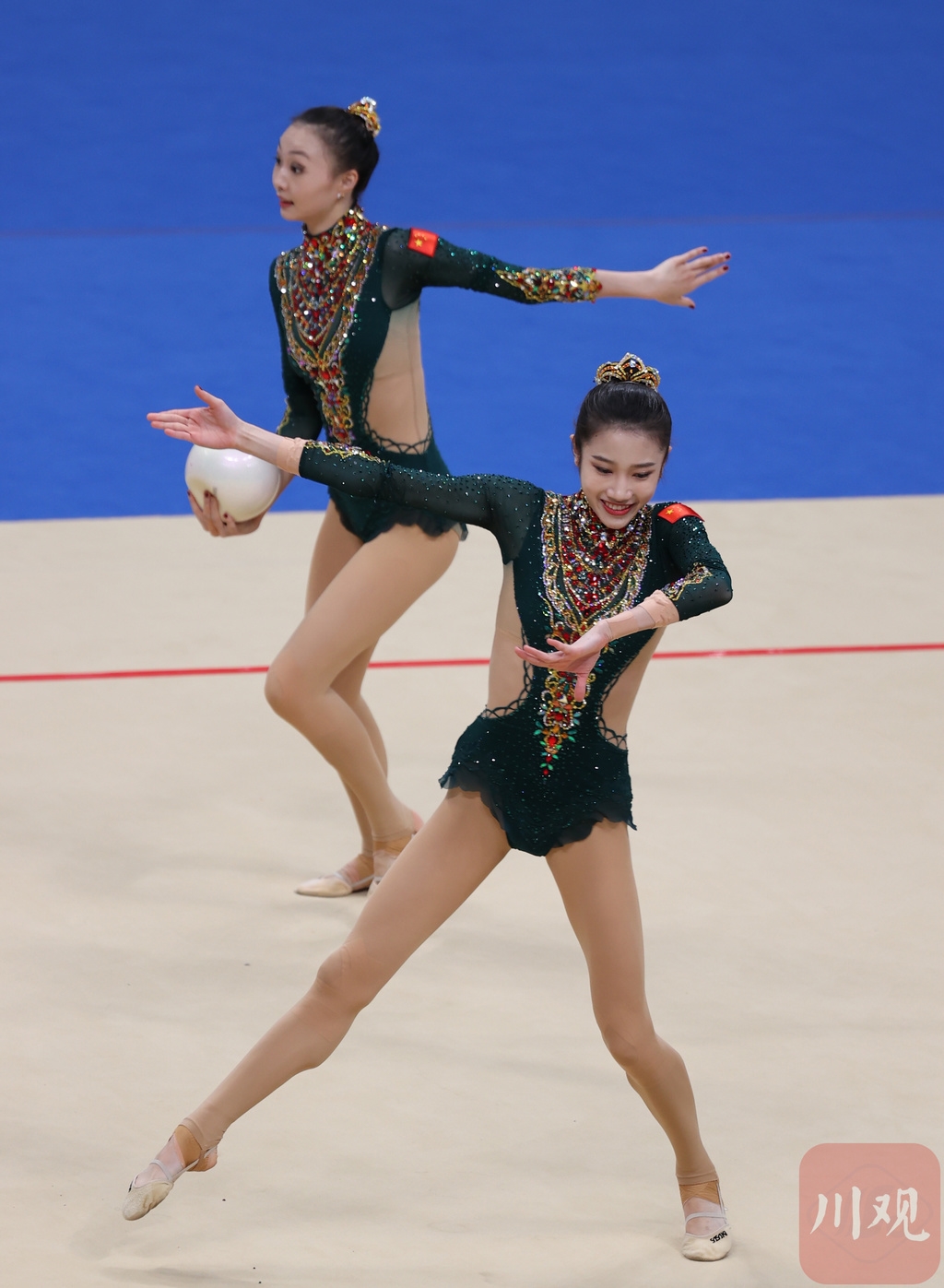 在今年8月刚刚结束的东京奥运会上,中国队以42.400的得分排名第四,距离登上领奖台只有0.450分的微弱差距。而在今天的全运会赛场上,奥运班底组成的联合队在5球和3圈4棒两个项目的发挥都非常出色,分别拿到了44.35分和43.10分,最终以总成绩87.45分毫无悬念地获得了团体全能的金牌。