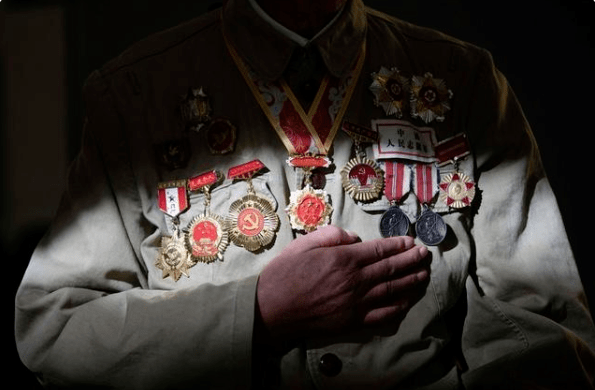 志愿军老战士周继成抚摩纪念勋章(2021年9月29日新华社记者 胥冰洁 摄 于四川省乐山市)