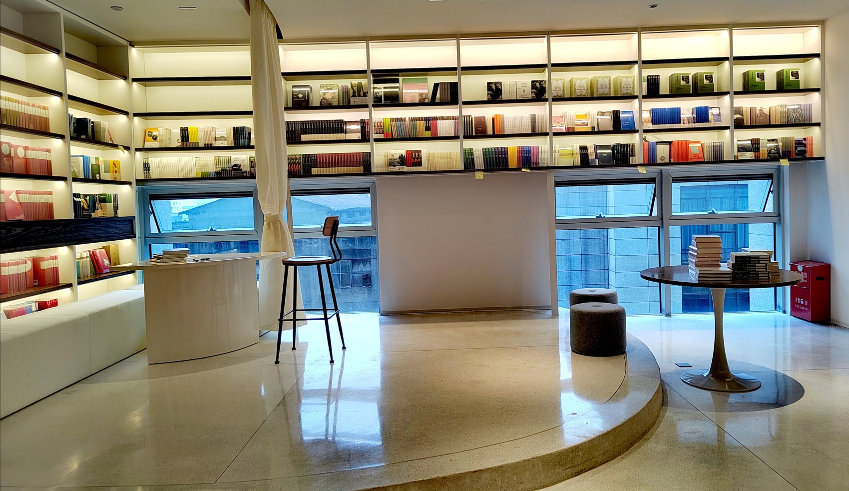 书房的入口设计抛却了“门”的束缚,白色亚克力材质的书页板装点在墙上,随风轻轻拨动,发出翻书的窸窣声,很美好的感觉。与其他书店的陈设不同,阿来书房完全体现了阿来所期许的“开放自由”。步入书房,空间里没有过多的装饰和隔断,一览无余的空灵。总面积达576㎡的书房,这样的设计是奢侈的,却也是最有文化气息的,因为所有到访者的目光都会投向两旁的书架,眼里只有书。阿来曾说过:“有人问我为什么要在川报集团做一间书房,我说那儿多好啊,比我家大多了,能放好多书呢!”所以,书,是书房的灵魂所在,是阿来的情怀所在。