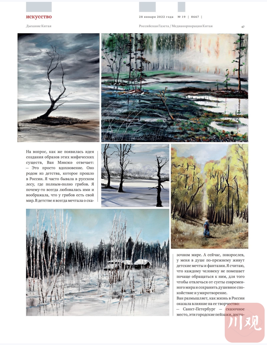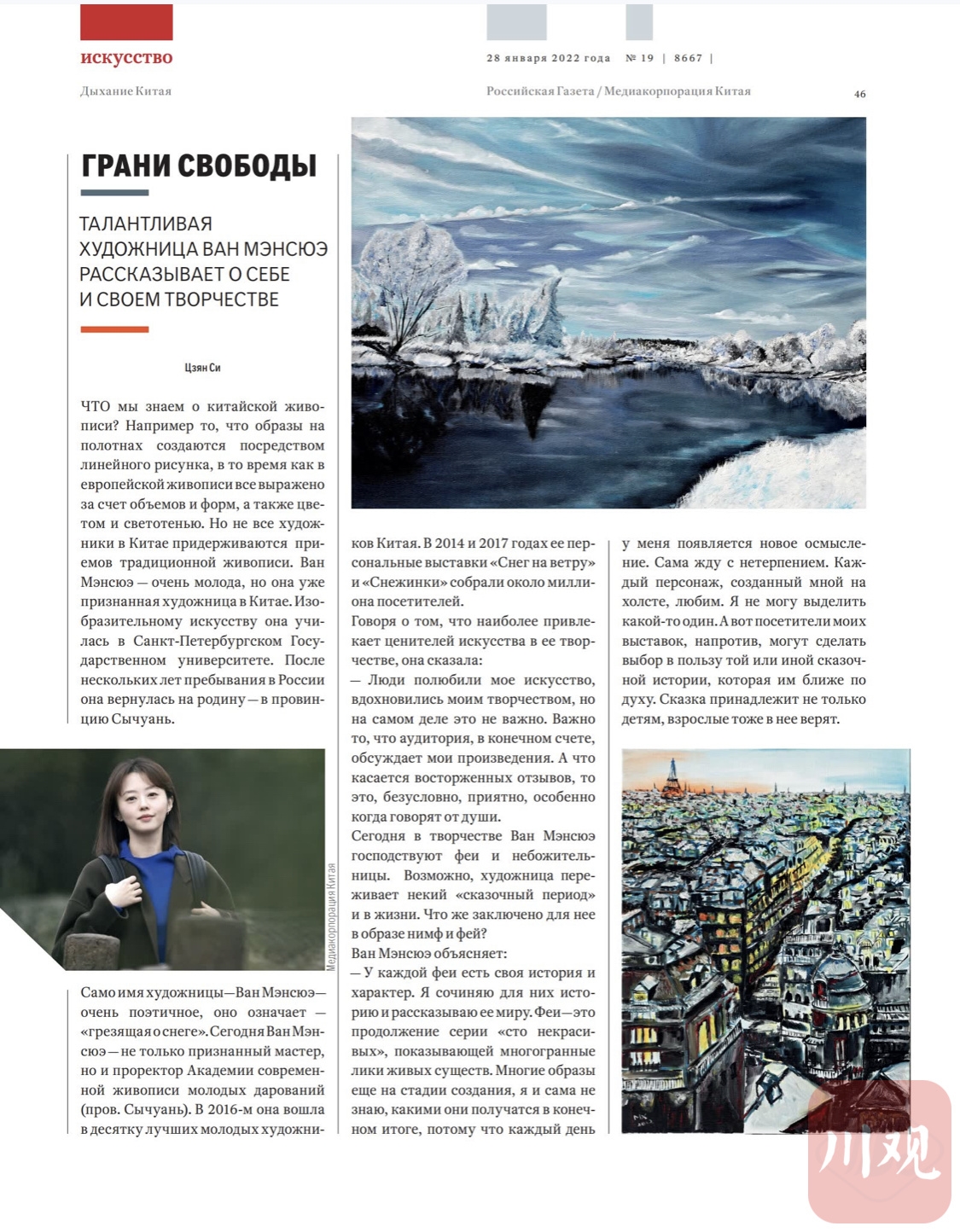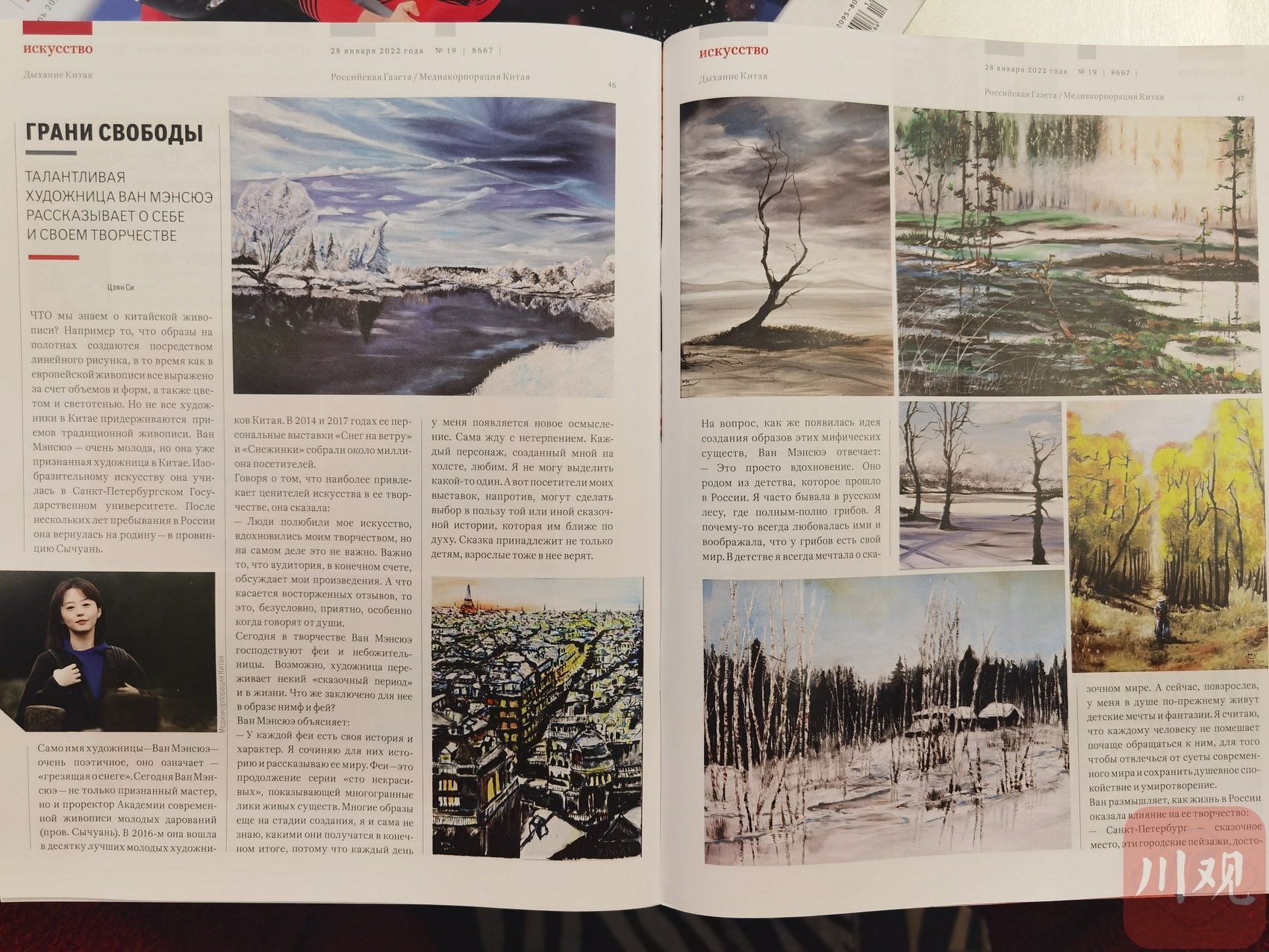 2022年2月22日,四川青年画家王梦雪收到来自俄罗斯的《中国风》杂志。在全球关注的北京冬奥期间,她的系列油画作品登上了在俄发行的杂志《中国风》冬奥特刊。杂志通过3个页面介绍了王梦雪以《雪》为主题的系列,9幅作品入选,其中4幅作品以俄罗斯圣彼得堡的雪为创作主题,5幅作品以四川的雪为创作主题,这也是王梦雪绘画作品首次刊登在外文杂志上。