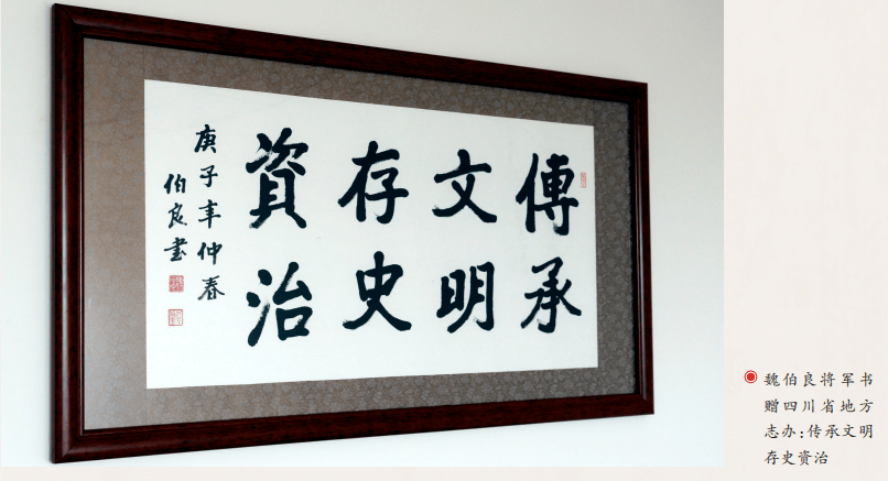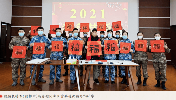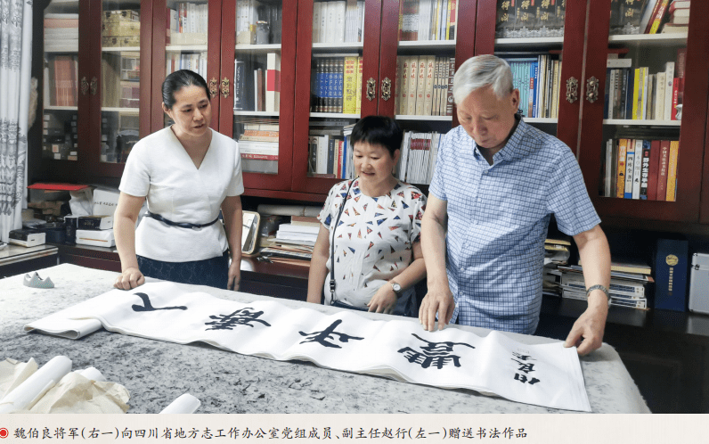 如今,87岁高龄的魏伯良将军仍精神矍铄、耳聪目明,书法创作时提笔有力、下笔劲健,作品柔韧有余、轮廓鲜明。他的书法是对传统艺术的继承和沿袭,亦是对现代作品的创新和突破。退休20多年来,他行走各地,积极参加书法公益活动,也与文艺界的新朋故友结下真挚友谊。他的足迹走遍山山水水、墨迹也留在五湖四海,无论是在洪雅县高庙镇为古镇老街村民写对联,还是参加眉山市文联组织的百人送万福活动,或在丹棱县幸福古村,他都是一个非常受追捧和敬仰的书法家。在仁寿老家,春节到了,即使在寒风凛凛中,他也和当地书法家们一起,为当地百姓写春联、送祝福,一写就是两个多小时。“群众有需求,我就没理由拒绝。”即便腰酸背痛,他也一直在坚持。在上海,他也会每年抽一些时间为战士们义务书写书法作品。