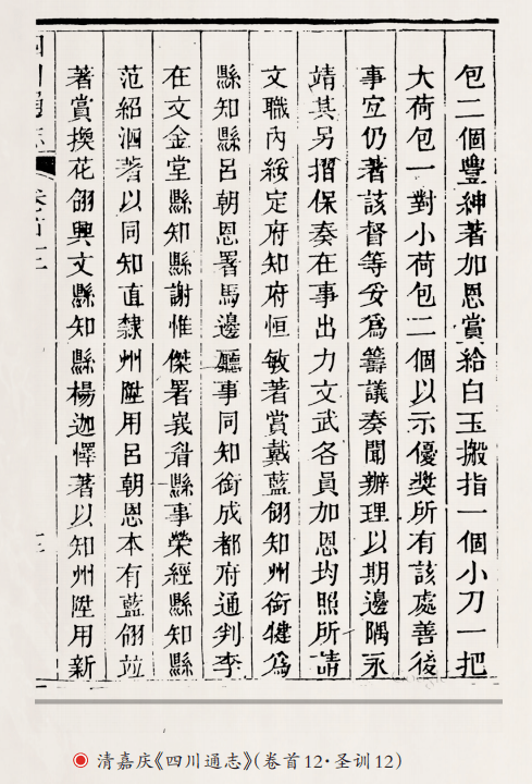 有趣的是当时清溪县(今雅安市汉源县)隶属于雅州府,雅州府和嘉定府同属建昌道。这趟差事中吕朝恩“越境”来到雅州府属地,其署嘉定府知府一职,也就相应变成署雅州府知府。清嘉庆十九年底成都知府出缺,由当时不在任上的雅州知府叶文馥调署;而雅州知府印务,四川总督常明奏请由吕朝恩正式接署,“查直隶酉阳州知州吕朝恩为守兼优,结寔可靠,前曾委署该府(雅州府)印务,经理裕如。如委令署理,亦堪胜任。除分饬该员如赴署任外,理合恭折具奏,伏乞皇上睿鉴。谨奏。”“嘉庆二十年正月初九日奉朱批:知道了。钦此。”(《国朝名臣奏议》卷1·321—322页)