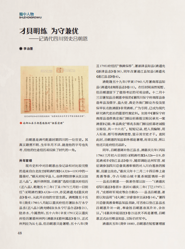 【人物】才具明练 为守兼优——记清代四川贤吏吕朝恩‖李治墨