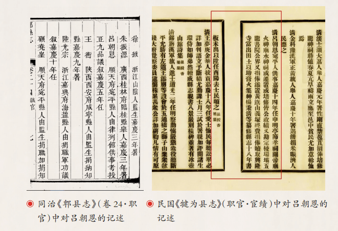 清嘉庆十三年(戊辰1808),“十三年七月十八日内阁奉上谕,本日勒保由六百里奏报生番缚献首逆乌卜……另折保奏在事出力文武各员加恩,均照所请……知州衔犍为县知县吕朝恩署马边厅事、同知衔……吕朝恩本有蓝翎,并著赏换花翎”(清嘉庆《四川通志》卷首之12)。由此,吕朝恩成为正五品同知衔犍为知县署马边厅事,赏戴花翎。之后,吕朝恩在犍为着实干了几年,是他一生中政绩最多的时候。据不完全统计,清嘉庆《犍为县志》和民国《犍为县志》提到吕朝恩名字20余处,提到与他直接或间接相关之事40余处。如“清嘉庆十三年(戊辰1808)知县吕朝恩将犍为县城垣全城加高约二尺,并修犀江门左城身九丈,犹取石材于惩非镇,所取石材即原旧城墙基石也”(民国《犍为县志》)。重修县学、普济桥、太平桥、天生桥、黄旗山义冢等,在当时都有特定的时代意义。此外,文昌阁、申明亭、节孝祠、文庙、武庙(关帝庙)、火神庙、水神庙等,“或迁置,或培修”,都属于当时的文化类建设。而“勘定校场坝(演武厅)、五龙书院公界”以便修缮,则都排除人为障碍,有过一番特别的努力,尤其是为修县志做出很大努力。