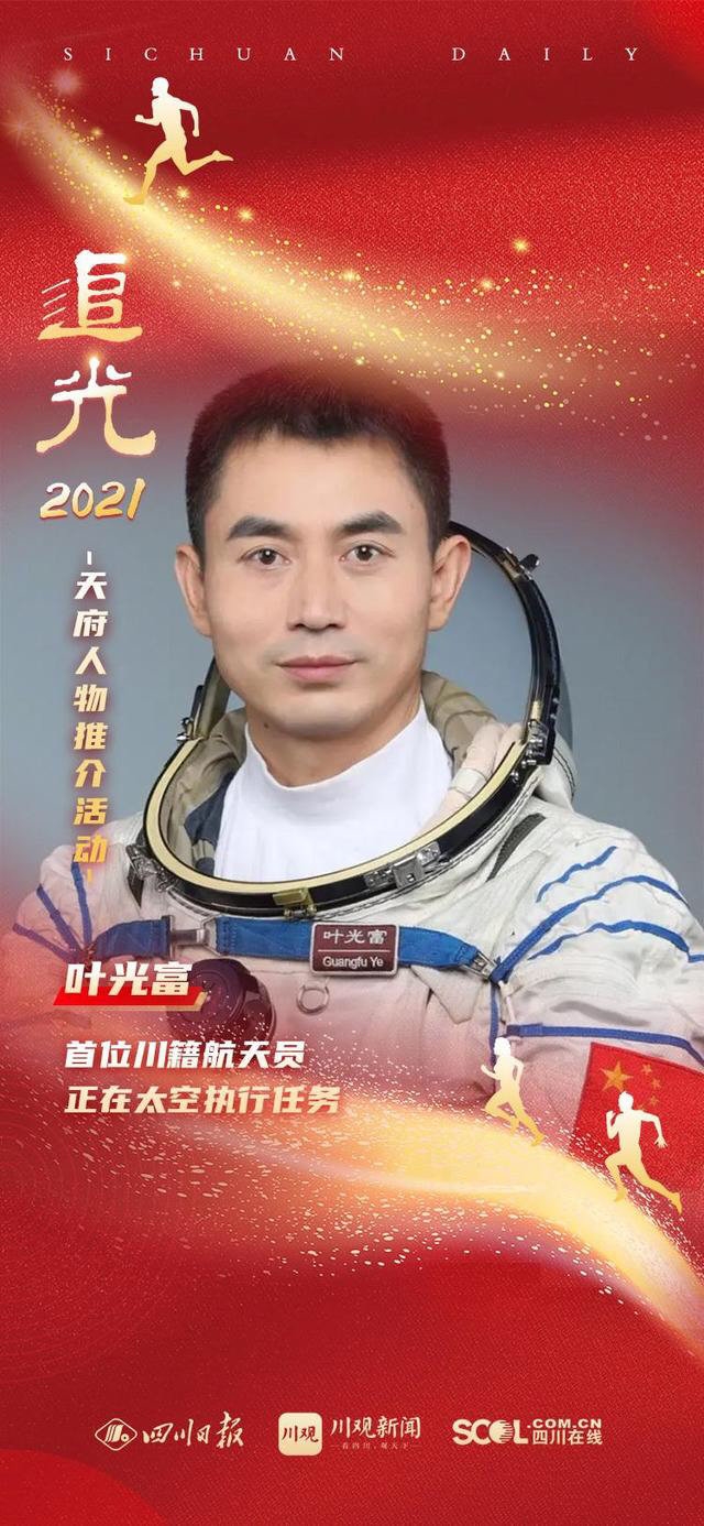 今年3月18日,由四川日报全媒体发起并主办、四川天府新区党工委承办的追光2021·第二届天府人物推介活动揭晓最终榜单,来自四川天府新区的航天员叶光富获选“十大天府人物”。颁奖词中写道:“巡航在天河,手可摘星辰。从寒门子弟到首位川籍航天员,正在太空出差的他,追随几代中国航天人的精神,担负着探索未知世界的使命。”