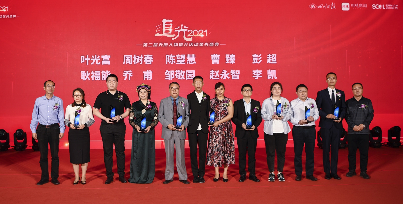 叶亚丹(左二)代弟弟叶光富领取“十大天府人物”奖杯
