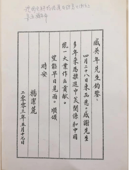 2003年5月17日,时任驻美大使杨洁篪给臧英年教授的回函