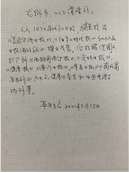 2022年5月15日,臧英年教授就投稿事致本文作者陈龙狮的信件