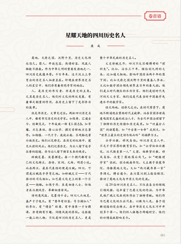 蜀地,天府之国,沃野千里,历史文化绵延悠久。蜀人,开放包容,热情好客,风流人物数不胜数。作为中华文明的重要发源地之一, 四川历史底蕴丰厚。千百年来,这片沃土上孕育出的历史名人灿若星辰。即便在世界历史名人的星空中,他们亦有着非同寻常的地位。