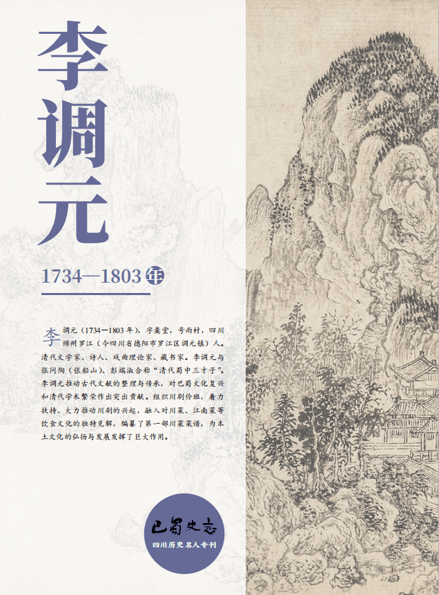 李调元(1734-1803),字羹堂,号雨村,四川绵州罗江(今四川省德阳市罗江区调元镇)人。清代文学家、诗人、戏曲理论家、藏书家。李调元与张问陶(张船山)、彭端淑合称“清代蜀中三才子”。李调元推动古代文献的整理与传承,对巴蜀文化复兴和清代学术繁荣作出突出贡献。组织川剧伶班,着力扶持、大力推动川剧的兴起,融入对川菜、江南菜等饮食文化的独特见解,编纂了第一部川菜菜谱,为本土文化的弘扬与发展发挥了巨大作用。