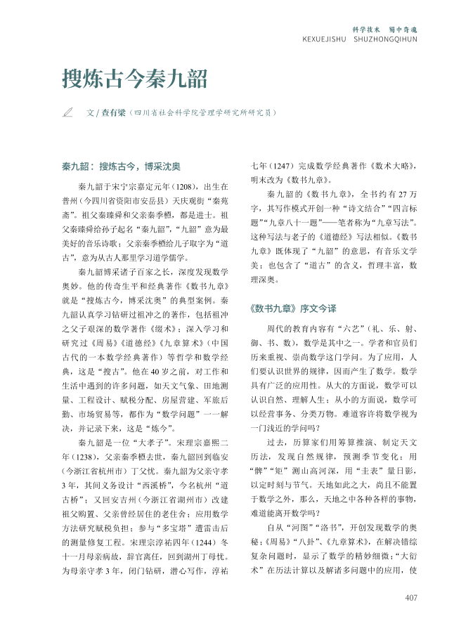 秦九韶博采诸子百家之长,深度发现数学奥妙。他的传奇生平和经典著作《数书九章》就是“搜炼古今,博采沈奥”的典型案例。秦九韶认真学习钻研过祖冲之的著作,包括祖冲之父子艰深的数学著作《缀术》;深入学习和研究过《周易》《道德经》《九章算术》(中国古代的一本数学经典著作)等哲学和数学经典,这是“搜古”。他在40岁之前,对工作和生活中遇到的许多问题,如天文气象、田地测量、工程设计、赋税分配、房屋营建、军旅后勤、市场贸易等,都作为“数学问题”一一解决,并记录下来,这是“炼今”。