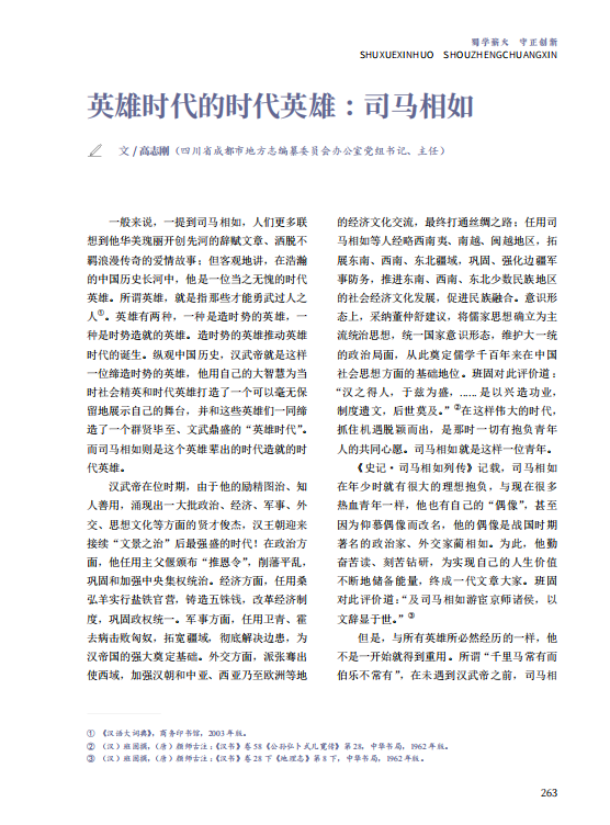 一般来说,一提到司马相如,人们更多联想到他华美瑰丽开创先河的辞赋文章、洒脱不羁浪漫传奇的爱情故事;但客观地讲,在浩瀚的中国历史长河中,他是一位当之无愧的时代英雄。所谓英雄,就是指那些才能勇武过人之人。英雄有两种,一种是造时势的英雄,一种是时势造就的英雄。造时势的英雄推动英雄时代的诞生。纵观中国历史,汉武帝就是这样一位缔造时势的英雄,他用自己的大智慧为当时社会精英和时代英雄打造了一个可以毫无保留地展示自己的舞台,并和这些英雄们一同缔造了一个群贤毕至、文武鼎盛的“英雄时代”。而司马相如则是这个英雄辈出的时代造就的时代英雄。