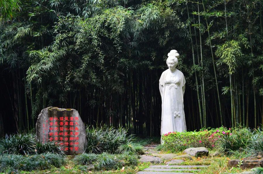 位于成都望江楼公园内幽篁深处,1984年建成,像高3米,由汉白玉雕成,塑像周围地面绿草如茵。草坪上的薛涛,体态丰盈,面如玉盘,罗衣微袒,高髻似冠,好像漫步于修竹茂林之中寻章觅句。