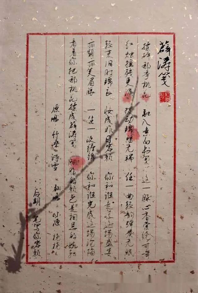 除了擅长书法外,薛涛还创制了风行一时、留传千古的“薛涛笺”,后人因其住在成都浣花溪旁,以溪水造纸,又称之为“浣花笺”。唐代诗人喜欢写绝句和律诗,而当时的笺纸却篇幅很大,薛涛“好制小诗,惜其幅大,不欲长剩,乃狭小之。”(《南部新书》载),遂制作了“薛涛笺”。“薛涛笺”是一种红色的小幅诗笺,各页尺寸划一,主要供写小诗之用。薛涛制作此笺,本为自己写诗之用,或赠送友人,但因其制作精美,使用方便,从它诞生之日日,就成为文人书斋中的宠儿。《笺纸谱》有云:“蜀笺自古有名,经薛涛而后精。”在历代文人心目中,它早已不是单纯的纸张,而是一种文化品牌和符号,更是一种精神寄托和风流雅韵的象征。元和五年(810年),唐代诗人李商隐在《送崔珏往西川》一诗中写道“浣花笺纸桃花色,好好题诗咏玉钩。”桃红灼灼,夭夭美妙,纸上的绯红桃花色妙在似露不露之间,写来全不吃力,却情谊毕现,充分肯定了薛涛创制的“薛涛笺”的品质。薛涛对造纸的贡献在于,开创了早期手抄加工纸的新品种之一:“笺纸”,同时在世界造纸史上,成为唯一一个以“一人一纸”而闻名的女性,可谓我国造纸界之精英,中华巾帼之翘楚。