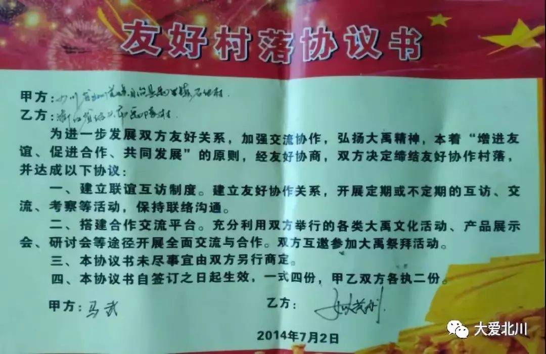 2014年6月,促成浙江绍兴禹陵村与北川石纽村成为友好村落。